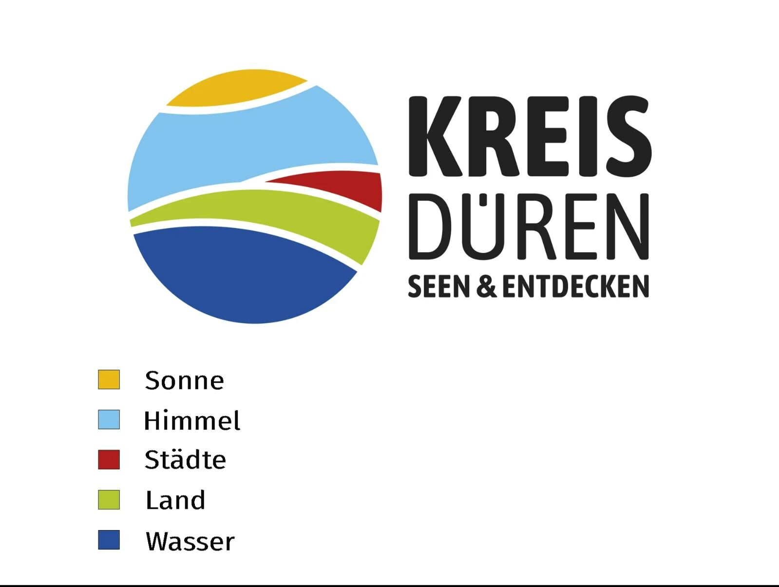 Sie stehen für Wasser (dunkelblau), Land (grün), Städte (rot), Himmel (hellblau) und Sonne (gelb). Das neue Logo gibt es seit 2021 und soll verdeutlichen, dass bei unserer Heimat Stadt, Land und Natur zusammengehören und für unsere Zukunft und im Strukturwandel wichtig sind.