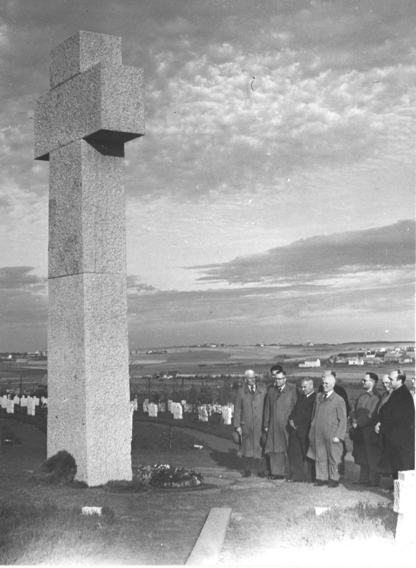 Die undatierte schwarz-weiße Fotografie stammt aus den frühen 1950er-Jahren. Der Besuchergruppe vor dem Hochkreuz eröffnet sich noch der unverstellte Blick in die weite Landschaft. Rechts unterhalb des Horizonts liegt Hürtgen.
