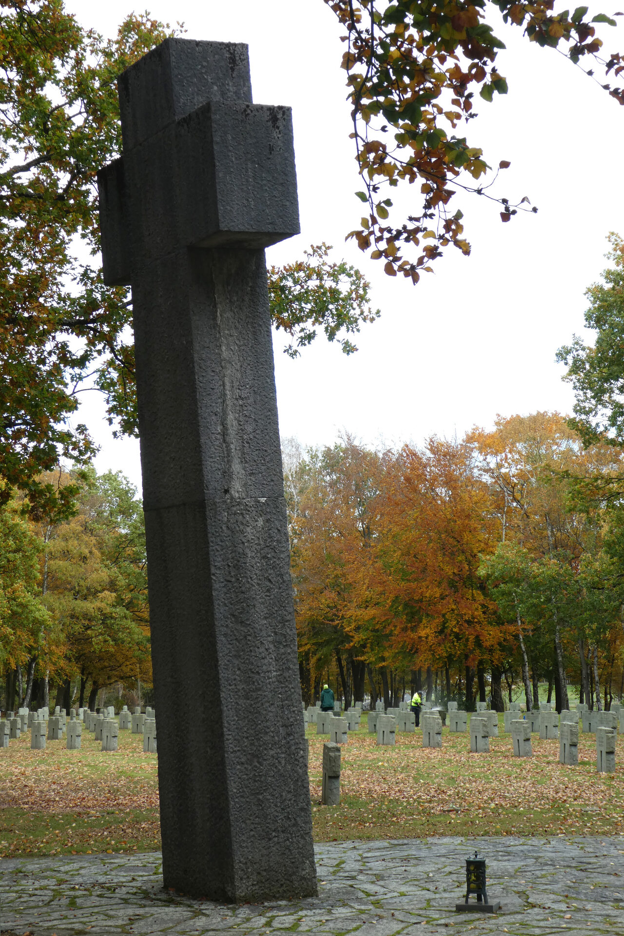 Das knapp 70 Jahre später aufgenommene Farbfoto macht deutlich, wie sich der Baumbestand in den zurückliegenden Jahren entwickelt hat. Außerdem ist erkennbar, dass sich das Hochkreuz inzwischen leicht geneigt hat und aufgrund der Witterungseinflüsse nachgedunkelt ist.