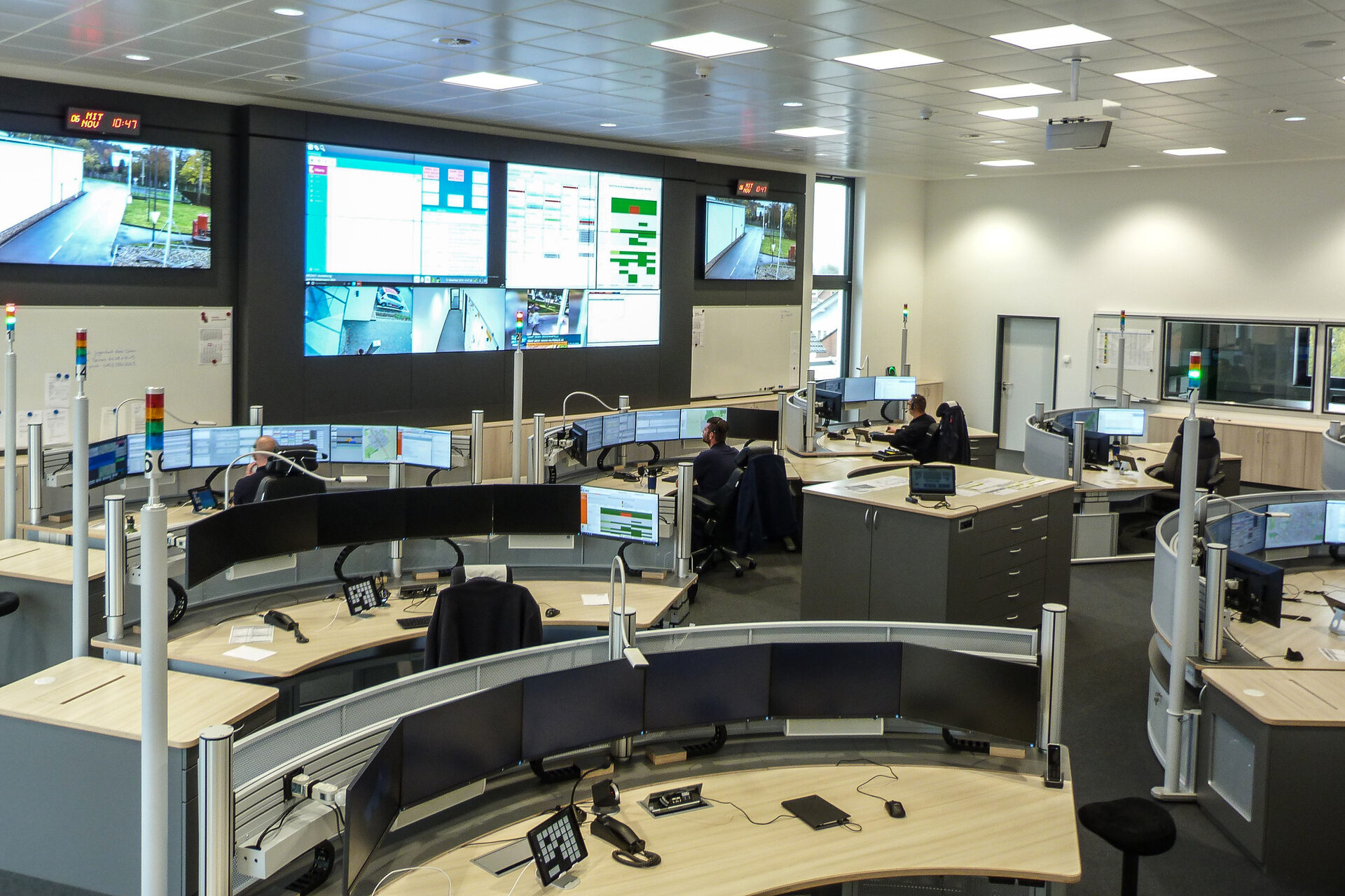 Die Einsatzleitplätze sind mit modernster Informations-, Leit- und Kommunikationstechnik ausgestattet. Bei Unwetterlagen und größeren Schadenslagen werden weitere 7 Ausnahmeabfrageplätze (sog. AAP) besetzt.