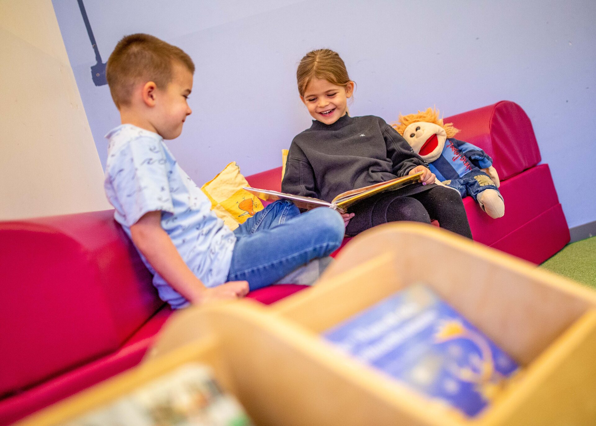 Eine bunte Auswahl an Konstruktionsmaterial, Gemeinschaftsspielen, Puzzeln und Büchern zur Beschäftigung wird allen Kindern im Freispiel angeboten.