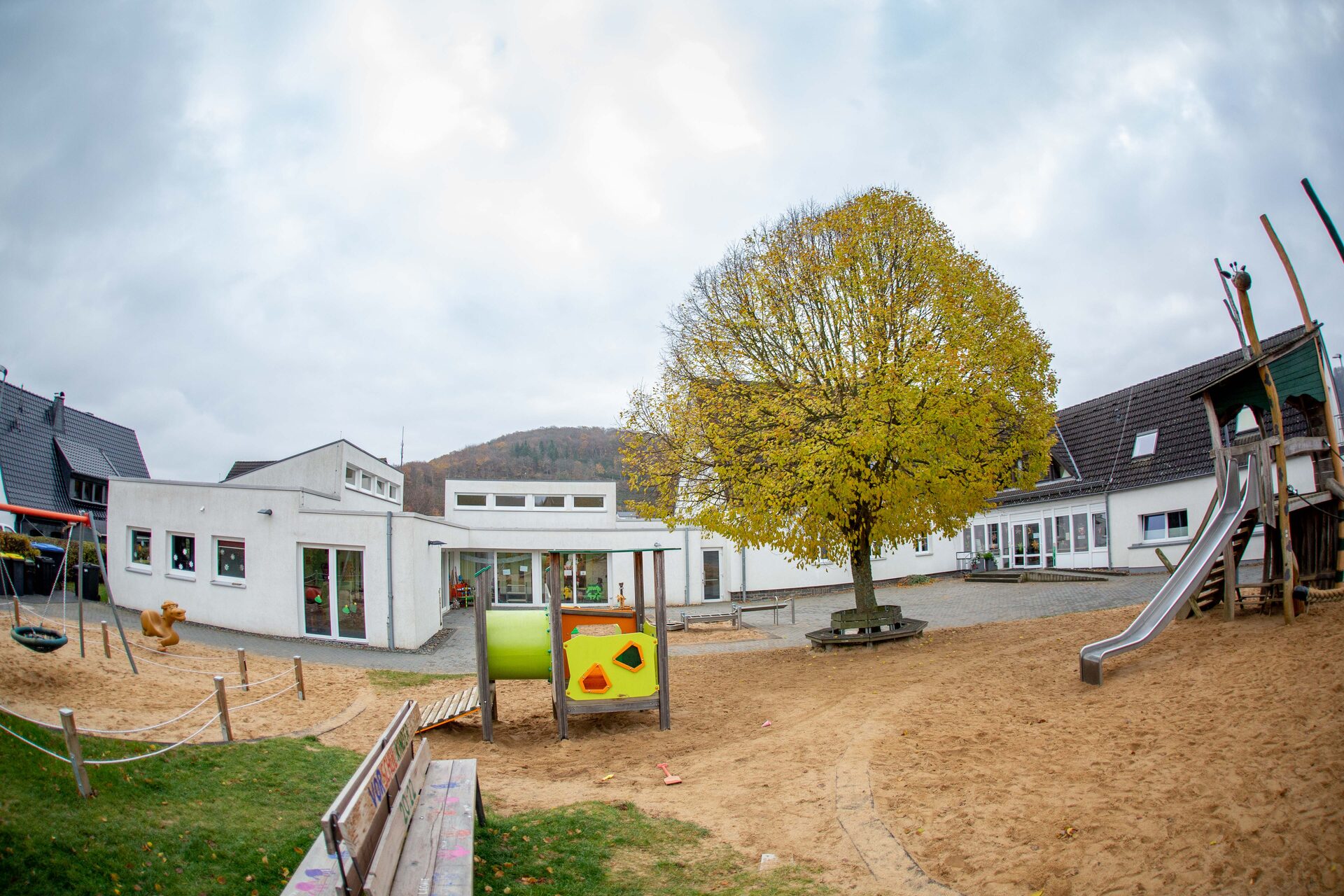 Die Einrichtung ist eingebettet in ein großzügiges Außengelände. In unserem großen Sandspielbereich steht eine Seilkletteranlage mit Rutsche, Hängematte und Türmen. Nicht nur für unsere Jüngsten leuchtet zusätzlich ein grünes Kletter- und Rutschspielgerät. Zum Schaukeln und Ruhen animiert eine Nestschaukel, die zum Schutz der Kinder durch ein Seil vom übrigen Spielbereich abgegrenzt ist.