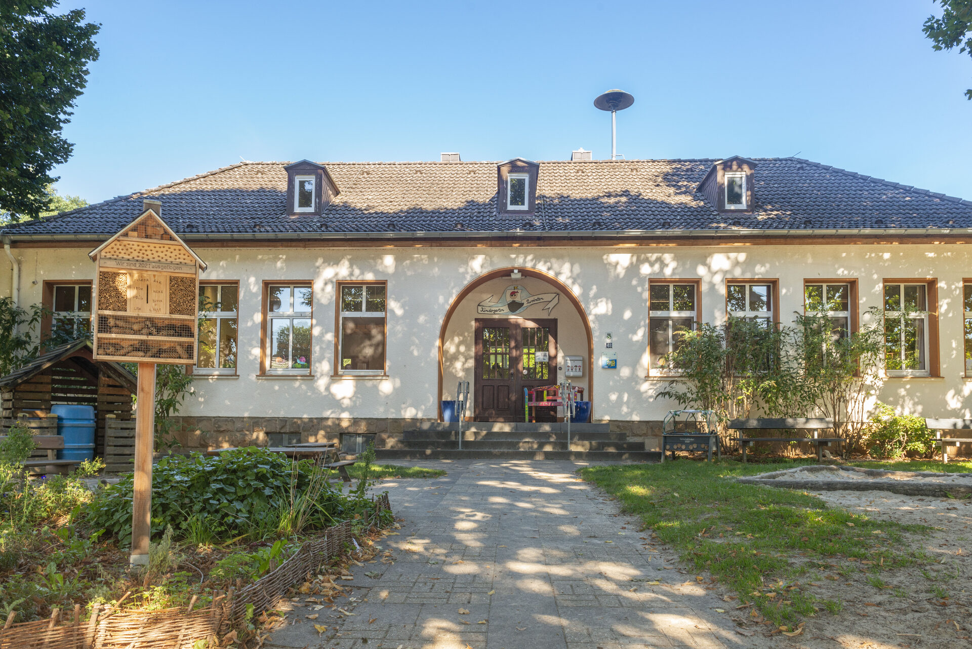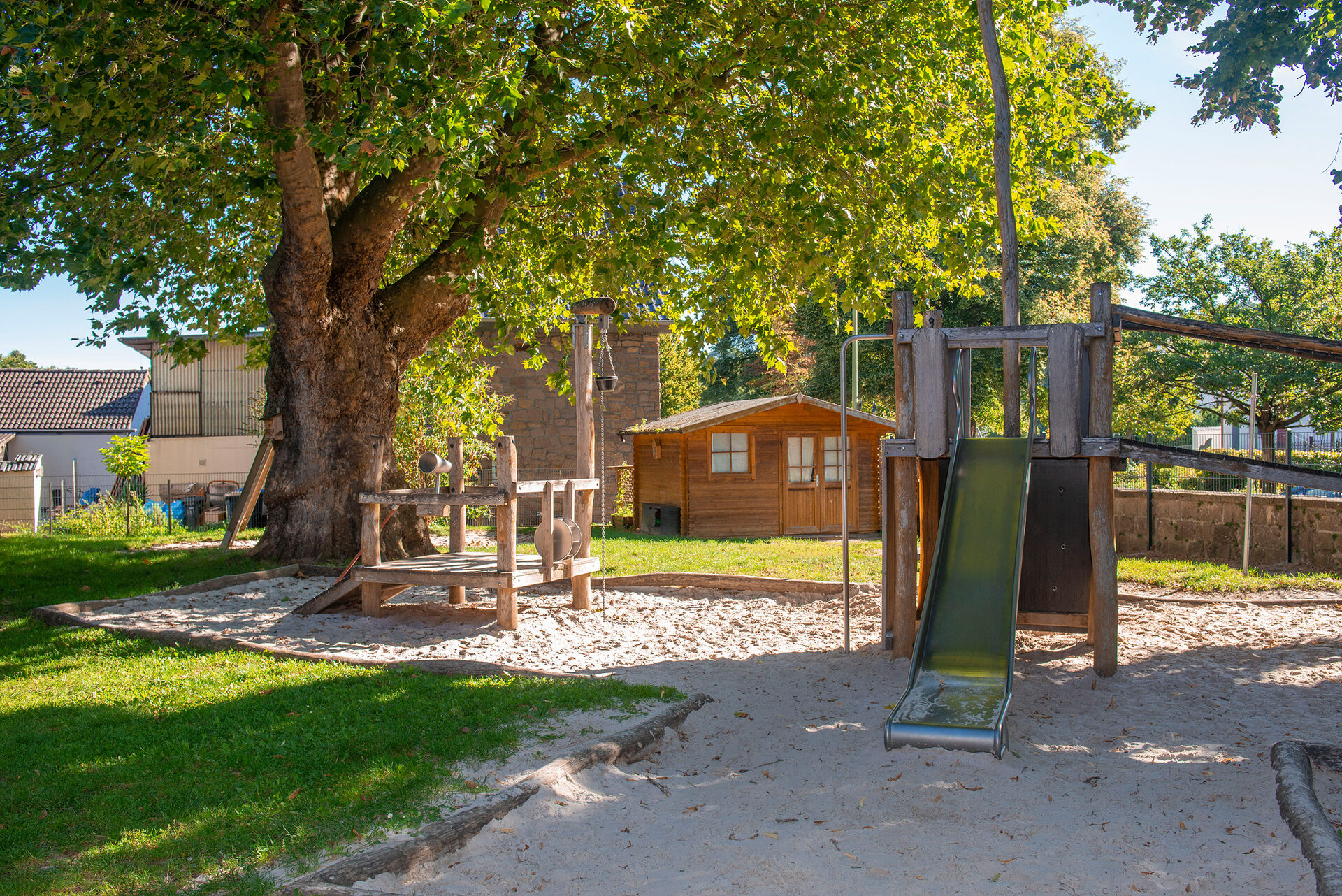 Die alten Baumbestände auf dem Außengelände bieten viele Möglichkeiten zum Spielen. Hier befinden sich ein Piratenschiff, eine Wassermatschanlage, eine Schaukel usw. Im Spielzeugholzhaus finden die Kinder eine Vielzahl von Sandspielzeugen sowie Bobbycars, Laufräder, Roller usw.
