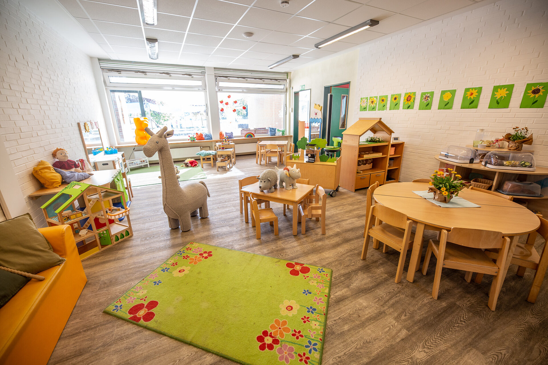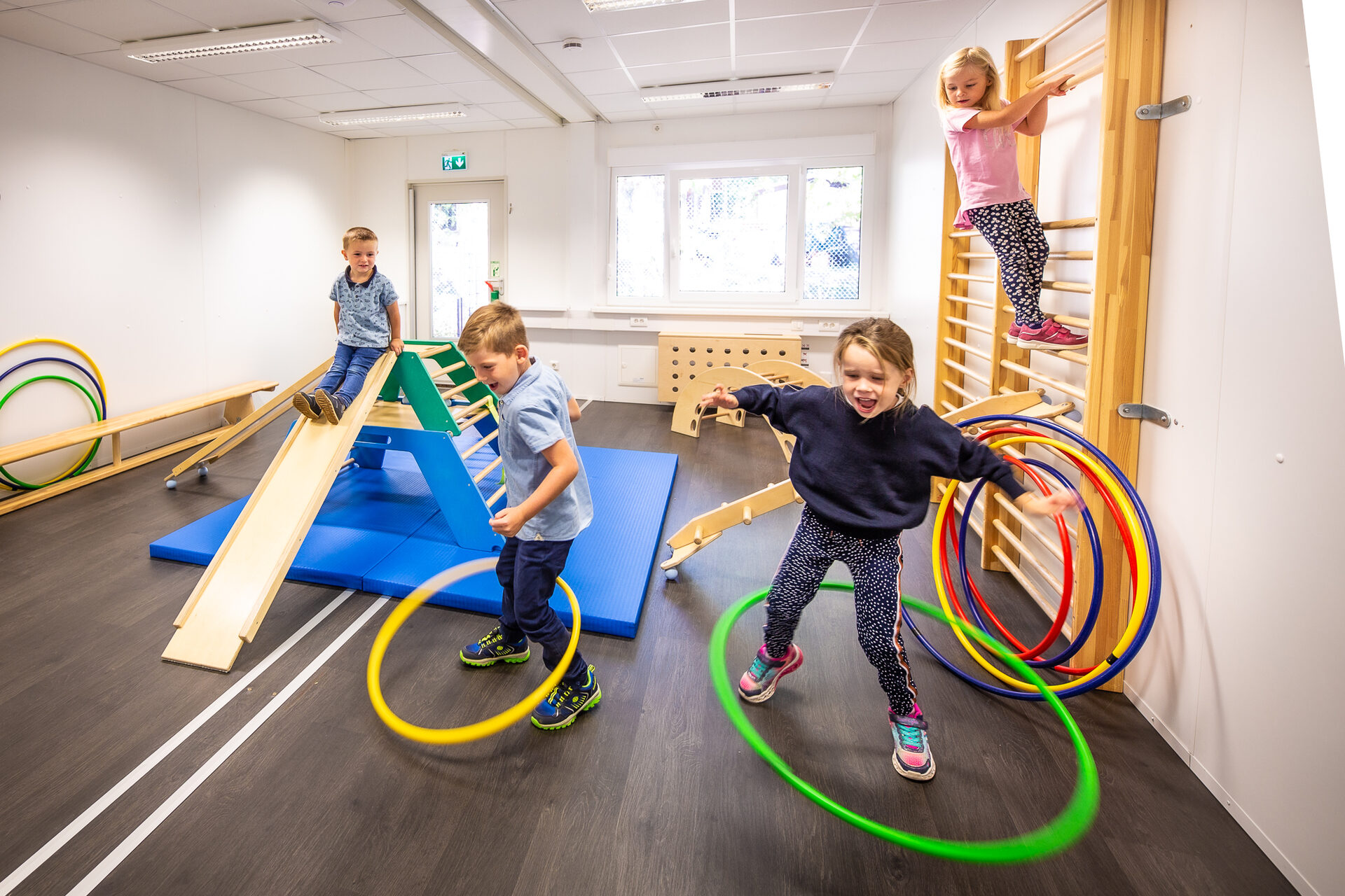 Unsere Kindertageseinrichtung liegt im ländlichem Ort Gey. Die Einrichtung zeichnet sich unter anderem durch die großzügigen, hellen und farbenfrohen Räumlichkeiten aus. Eine große Anzahl an Fenstern macht die Einrichtung hell, freundlich und gemütlich. Zusätzlich zu den Gruppenräumen verfügen 3 Gruppen über je 2 Nebenräume, einem separaten Wickelraum und einem Waschraum. 1 Gruppe hat einen Nebenraum und einen Waschraum, der Wickelraum befindet sich angegliedert in unserer großzügigen Kletterhalle. Im Eingangsbereich befinden sich Therapieräume, Büros und ein der Küche angegliederter großer Speisesaal. Dieser wird auch für andere Aktionen genutzt. Weiterhin gibt es einen Bewegungsraum und mehrere Abstellräume. Gemütlich eingerichtete Nischen dienen als Ruhezonen. Unser Eltern Café hat einen eigenen Raum und kann täglich genutzt werden.