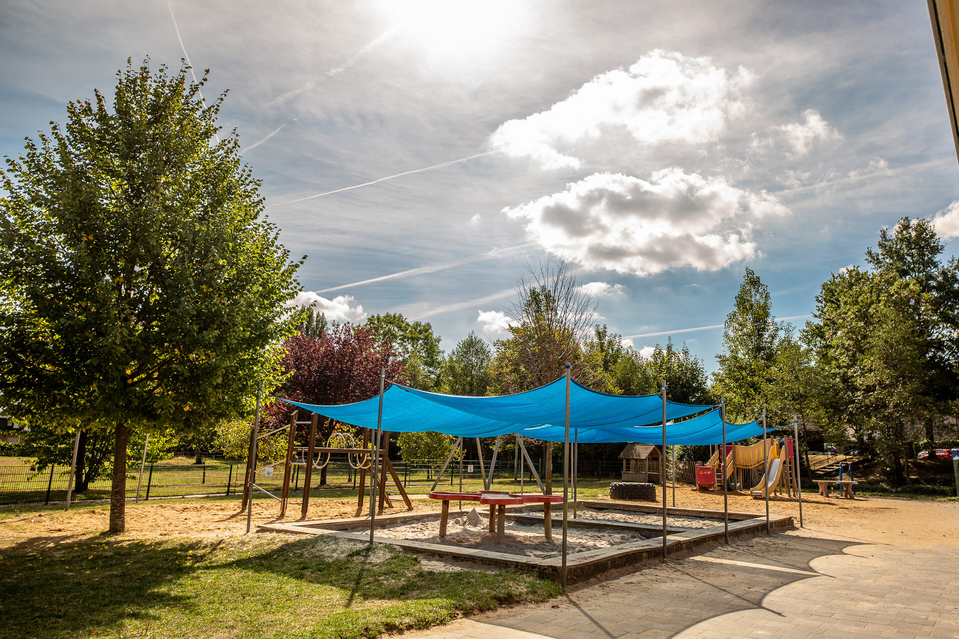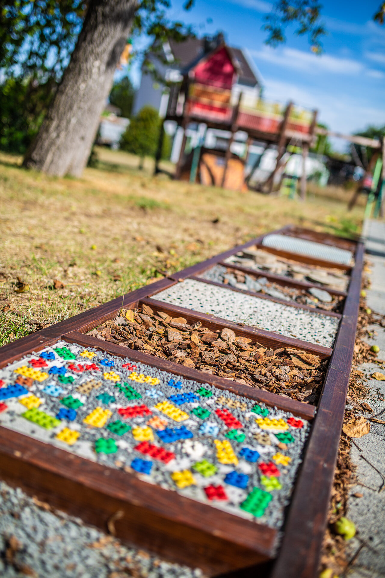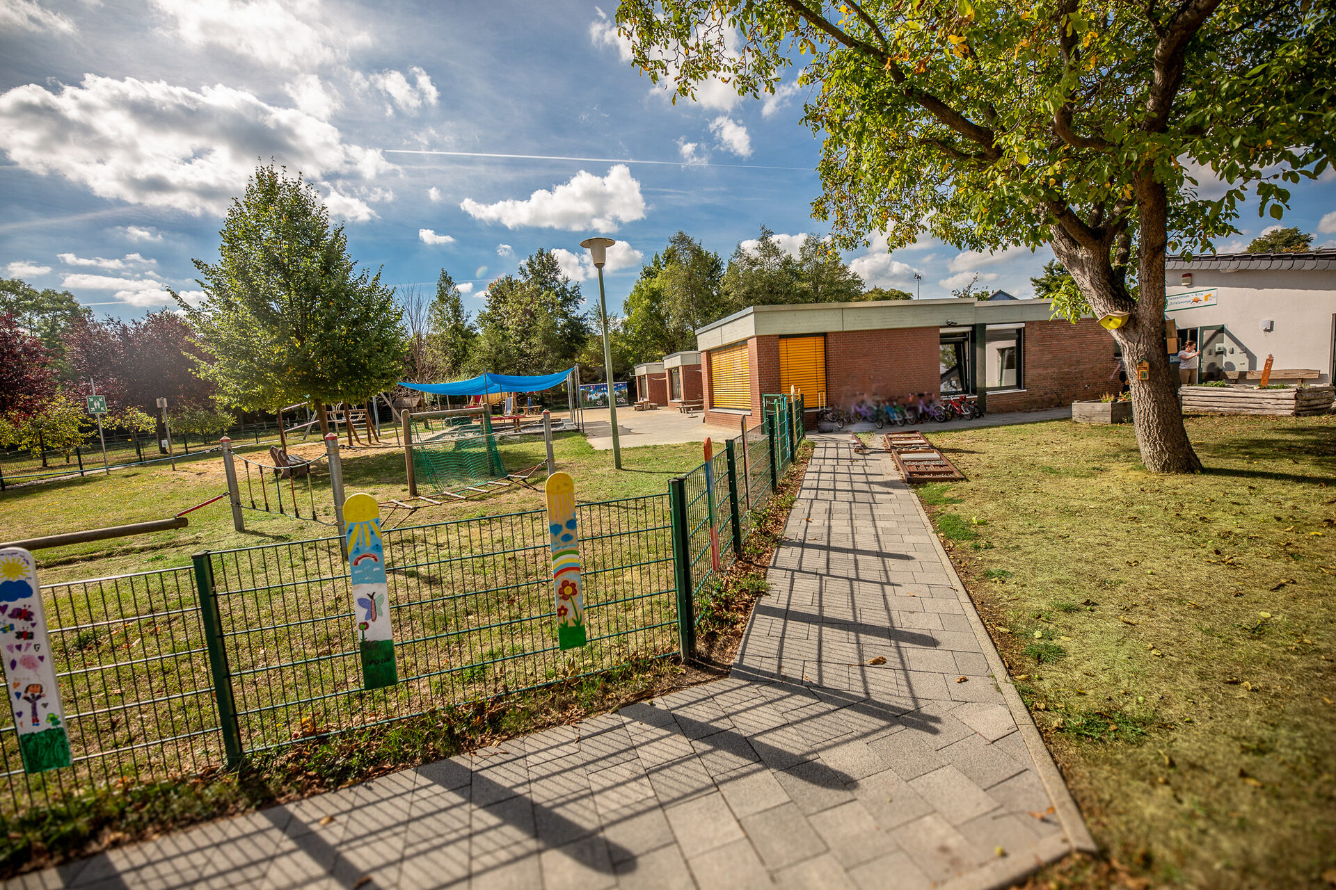 Unsere Einrichtung verfügt über ein Außengelände mit Bäumen, Sträuchern und Weiden. Auf unseren verschiedenen Rasenflächen befinden sich 2 Gartenhochbeete für die Kinder, 2 Nestschaukeln, 1 Hubbelrutschbahn und mehrere Kletterelemente für Kinder ab 2 Jahren. Unsere Holzhäuser und das Weidenhaus laden die Kinder zum Verstecken und Verweilen ein, gerne werden sie auch für Rollenspiele genutzt. Im Sandkasten und mit verschiedenen Materialien können die Kinder kreativ werden. Die zahlreichen, unterschiedlichen Fahrzeuge kommen auf den gepflasterten Wegen zum Einsatz.