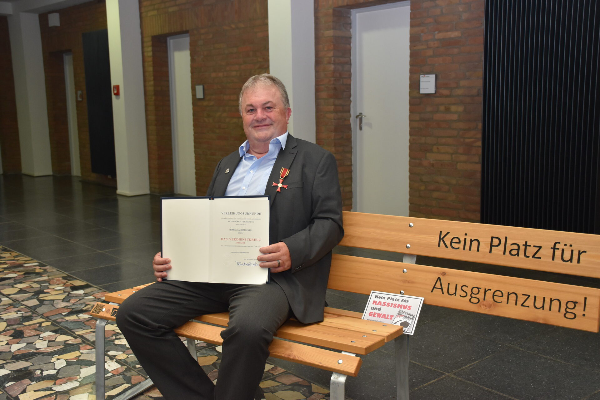 Seit 13 Jahren engagiert Joachim Ecker sich mit seiner Kampagne "4 Schrauben für Zivilcourage", die immer mehr Zuspruch bundesweit erhält. Dabei werden interessierten Vereinen kostenlos Schilder mit der Aufschrift "Kein Platz für Rassismus und Gewalt!" zur Verfügung gestellt. Auf seinen Wunsch hin wurde zudem an dem Abend auch die "Bank gegen Ausgrenzung" durch das Dürener Bündnis gegen Rechtsextremismus vorgestellt, das er gemeinsam mit anderen Vereinen 2006 gründete. In jeder Kommune des Kreises wird diese Bank stehen, acht weitere werden an Schulen platziert. Die Bank hat einen fehlenden Sitzplatz auf der rechten Seite. Dies symbolisiert, dass Ausgrenzung keinen Platz findet. Die Bänke werden von der Lebenshilfe Heinsberg in Kleinserie produziert.