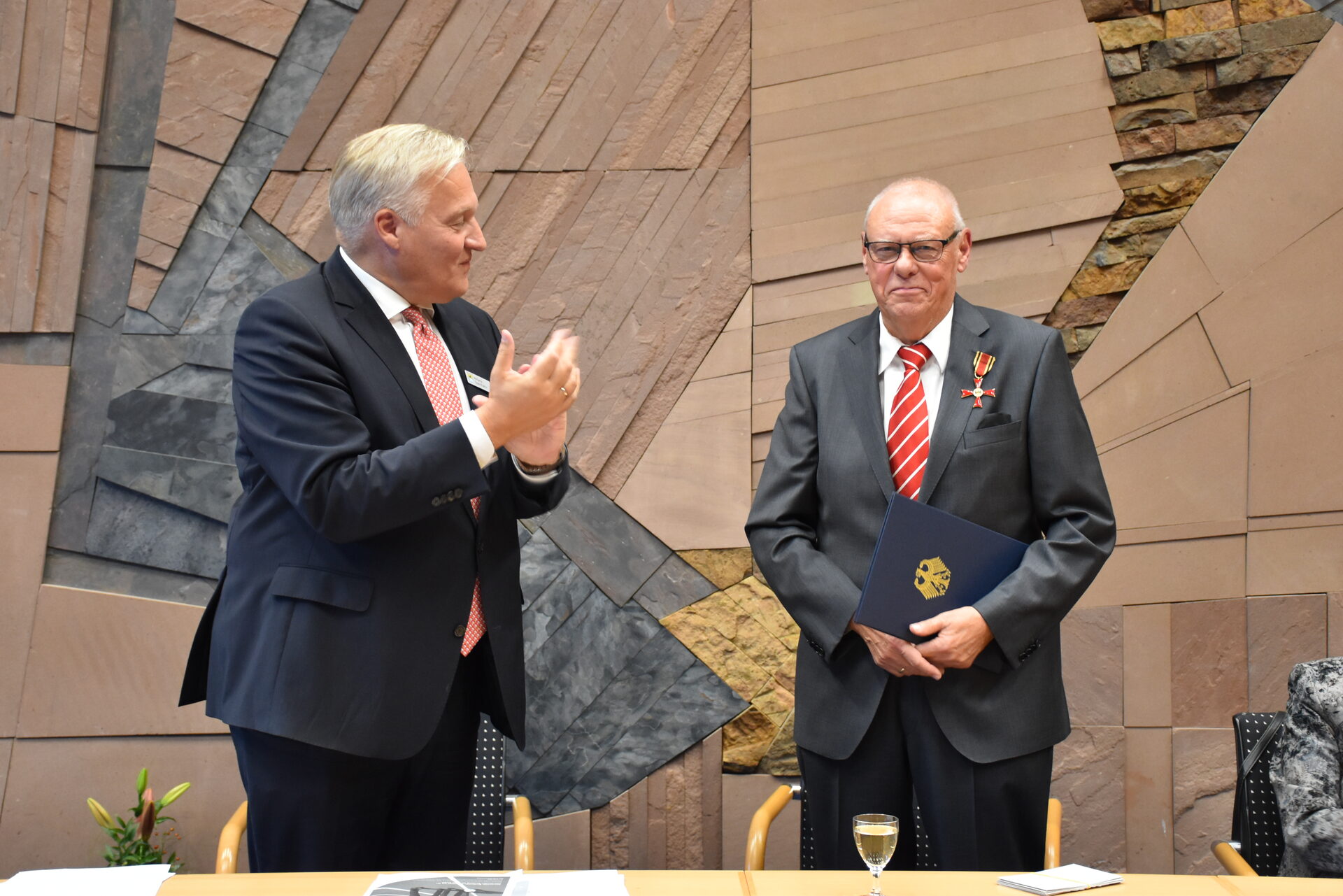 Für sein jahrzehntelanges Engagement erhält Manfred Schultze (r.) das Bundesverdienstkreuz, das ihm Landrat Wolfgang Spelthahn überreicht.