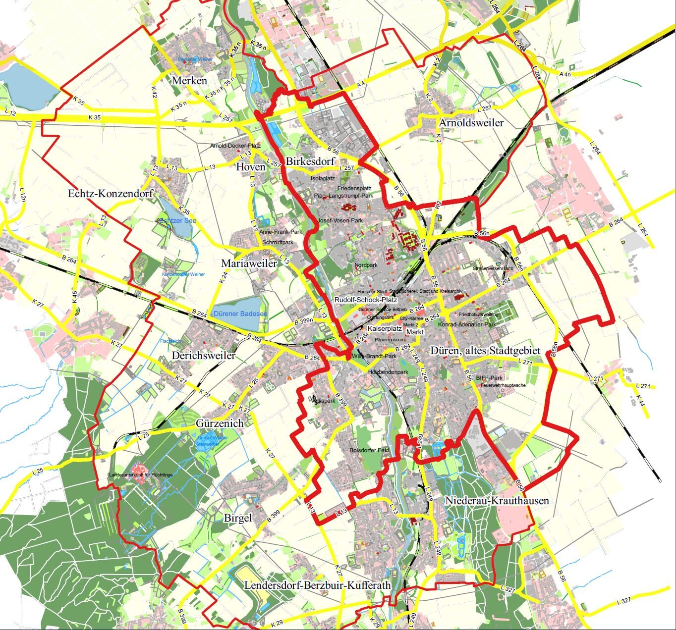 Hier die wesentlichen Maßnahmen der Allgemeinverfügung, die für das Gebiet der Stadt Düren gilt mit Ausnahme der Bezirke: Arnoldsweiler, Niederau-Krauthausen, Lendersdorf-Berzbuir-Kufferath, Birgel, Gürzenich, Derichsweiler, Echtz-Konzendorf, Mariaweiler, Hoven und Merken.