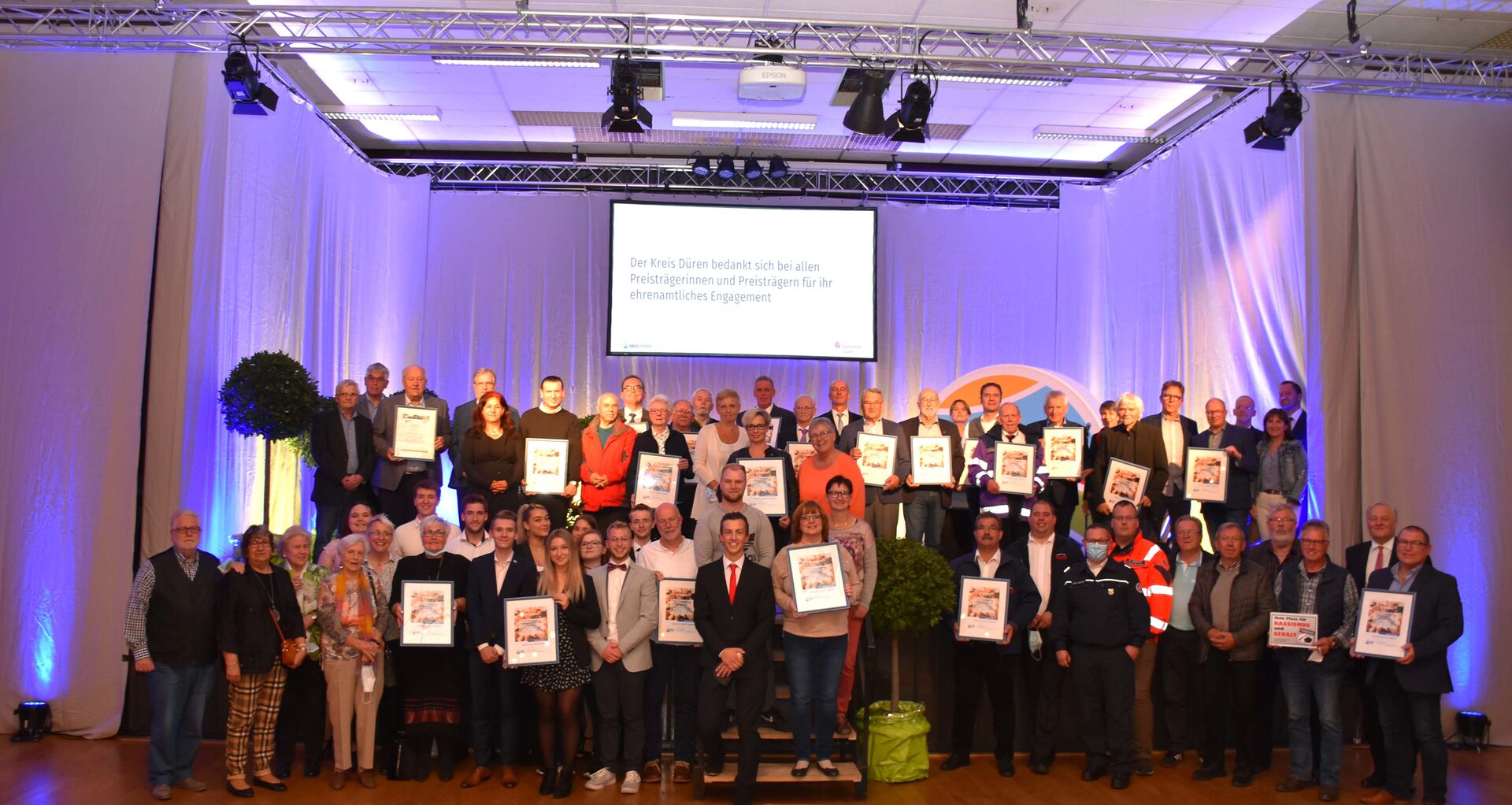 Dies trübte in keinem Fall die Stimmung. Im Gegenteil. "Der soziale Aspekt im Ehrenamt ist sehr wichtig. Daher wollten nahezu alle Preisträgerinnen und Preisträger lieber ein Jahr warten, um jetzt gemeinsam im feierlichen Rahmen den besonderen Tag zu begehen", sagte Landrat Wolfgang Spelthahn, der durch den Abend führte und die Lobreden hielt. "Der Kreis Düren möchte sich bei Ihnen bedanken. Ihr Engagement ist von unschätzbarem Wert", ergänzte er.