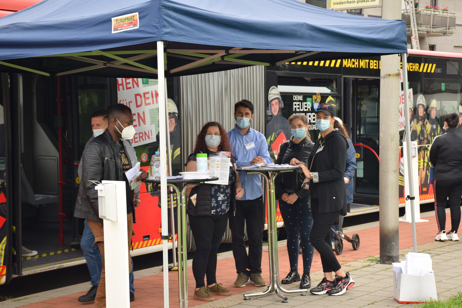 Damit dies gelingt, stehen an diesem Tag auch sechs Dolmetscherinnen und Dolmetscher zur Verfügung, die neun Sprachen abdecken. Zudem ehrenamtliche Helfer der angrenzenden Pfarre. Mit Flyern und Broschüren ausgestattet, informieren sie die Impfwilligen und klären über den Ablauf auf. Nach dem Ausfüllen der Formulare, wird die Impfung in einem umgebauten Bus der Rurtalbus GmbH durch einen Arzt vorgenommen, zwei medizinische Fachkräfte, drei Kräfte der Kassenärztlichen Vereinigung, zwei Bundeswehrsoldaten und das Deutsche Rote Kreuz unterstützen ihn dabei.