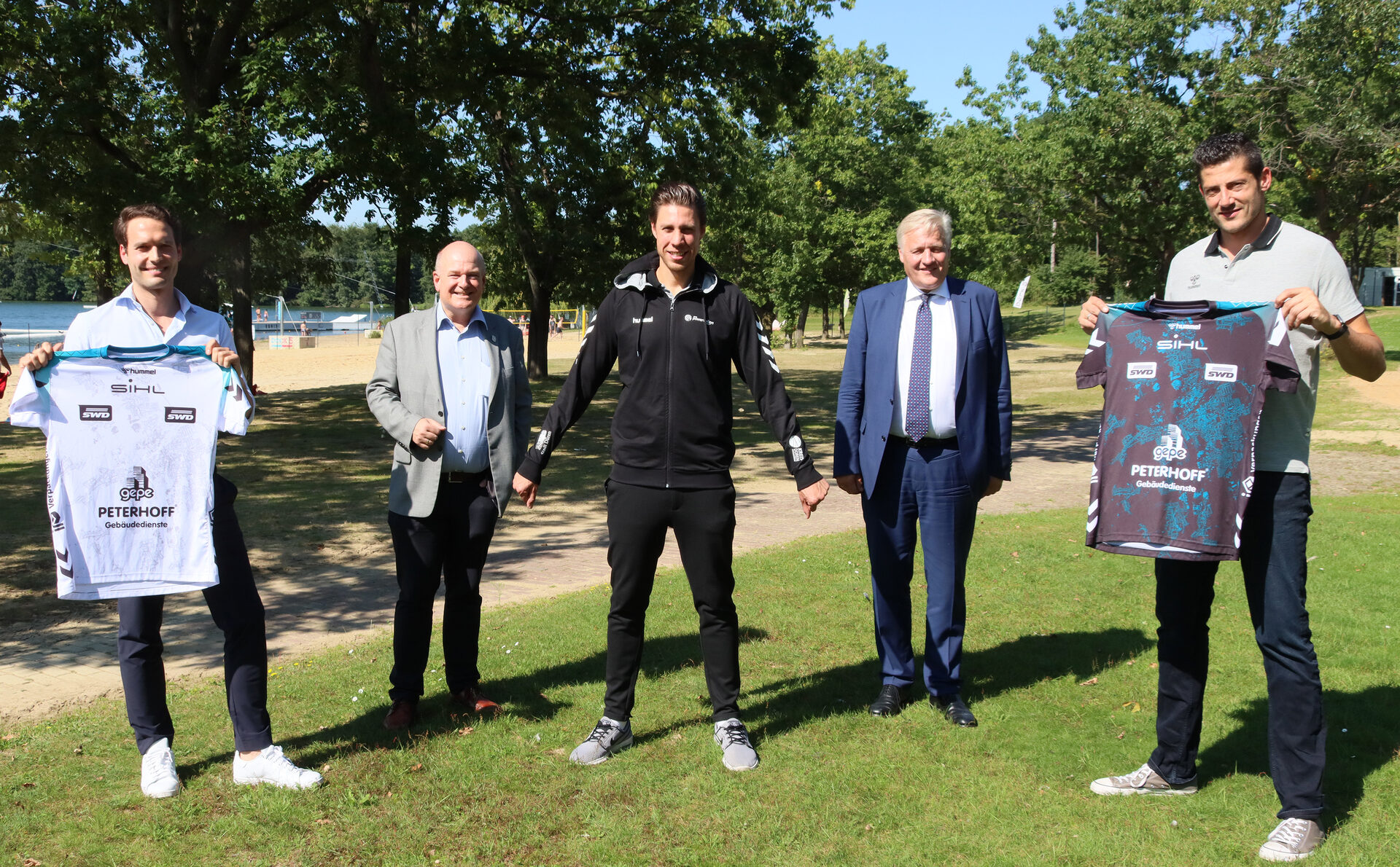 Landrat Wolfgang Spelthahn (2. v. r.) mit Powervolleys-Geschäftsführer Benjamin Kaulen (l.), Kapitän Michael Andrei (r.), Tomáš Kocian-Falkenbach (Mitte / trägt die Logos von Kreis und Stadt auf den Ärmeln) sowie Dürens Bürgermeister Frank Peter Ullrich.