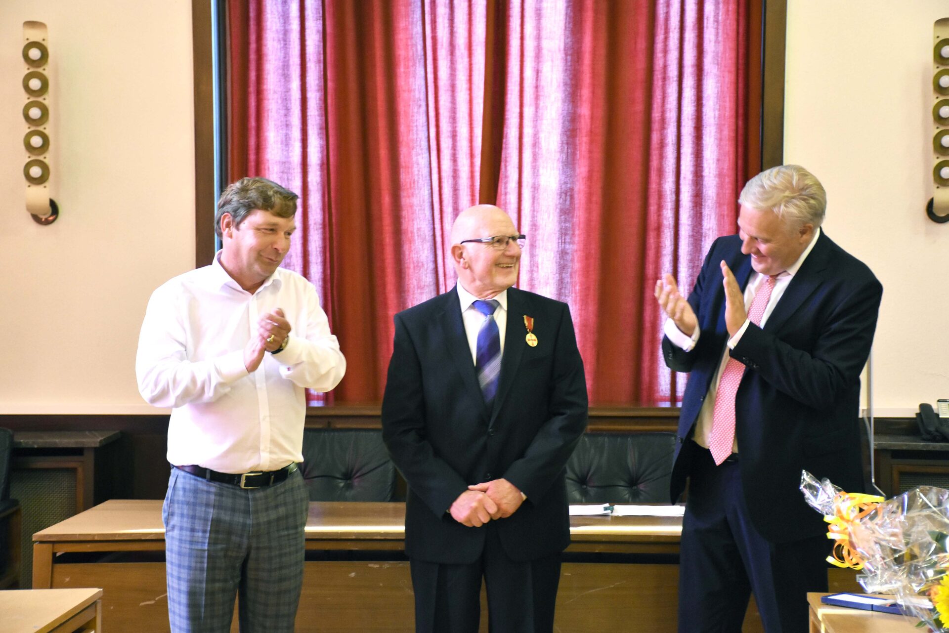 Rund zehn Jahre später erwarb er seine Übungsleiter-Lizenz und war bis 2019 in verschiedenen Sportgruppen der BSG als Übungsleiter tätig. Ob Volleyball, Männergymnastik oder Sport für Senioren – Friedhelm Augustin war stets mit großem Einsatz und Engagement dabei. Zuletzt war er 17 Jahre lang ehrenamtlich im Vorstand der BSG tätig und half bei der Organisation von Turnieren und weiteren Sportveranstaltungen. "Sie haben viele, viele Stunden Ihrer Zeit für den Sport gegeben und nie aufgehört, sich weiterzubilden. Dafür haben Sie auch alle Auszeichnungen bekommen, die der Verein vergibt", sagt der Landrat, bevor er eine nächste Auszeichnung, die Verdienstmedaille, überreicht.