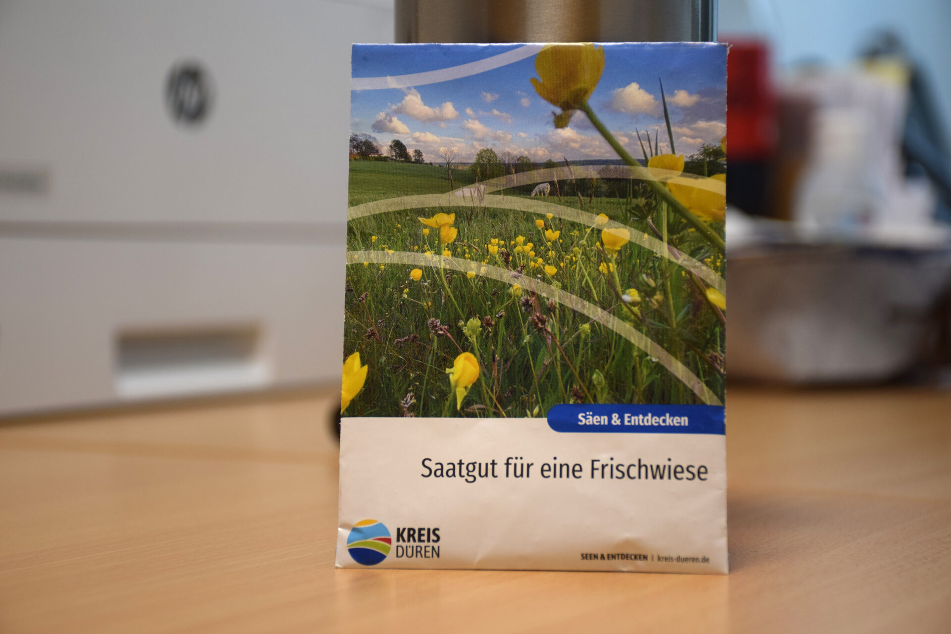Saatgut: Der Geschenkverpackung fehlt noch der letzte Schliff? Dann kleben Sie doch eines unserer kostenfreien Saatgut-Tütchen darauf! Darin enthalten ist eine Blühmischung, die in erster Linie heimische Pflanzenarten enthält. Daher bietet sie vor allem Insekten das notwendige Bau-, Nist- und Futterangebot. Das hier abgegebene Saatgut ist eine spezielle Mischung für die Region Niederrheinische Bucht/ Jülicher- und Zülpicher Börde. Mit der Ausgabe des regionalen Saatgutes wird im besonderen Maße der heimischen Flora und Fauna Rechnung getragen.Die Ausgabe der Saatgut-Päckchen erfolgt kostenlos an engagierte und naturverbundene Bürger. Der Beutelinhalt reicht für ca. 1 Quadratmeter. Das Saatgut ist hier erhältlich: Kreis Düren; Amt für Kreisentwicklung & Wirtschaftsförderung, Moltkestraße 37 in 52351 Düren.