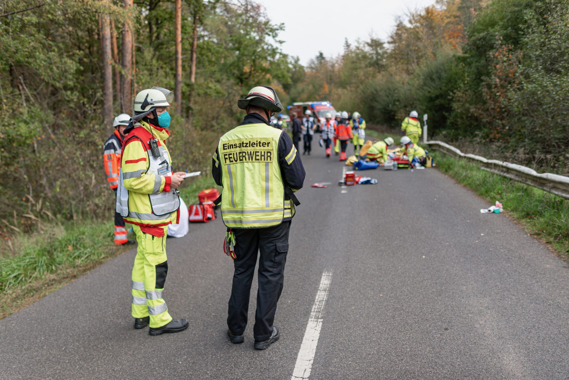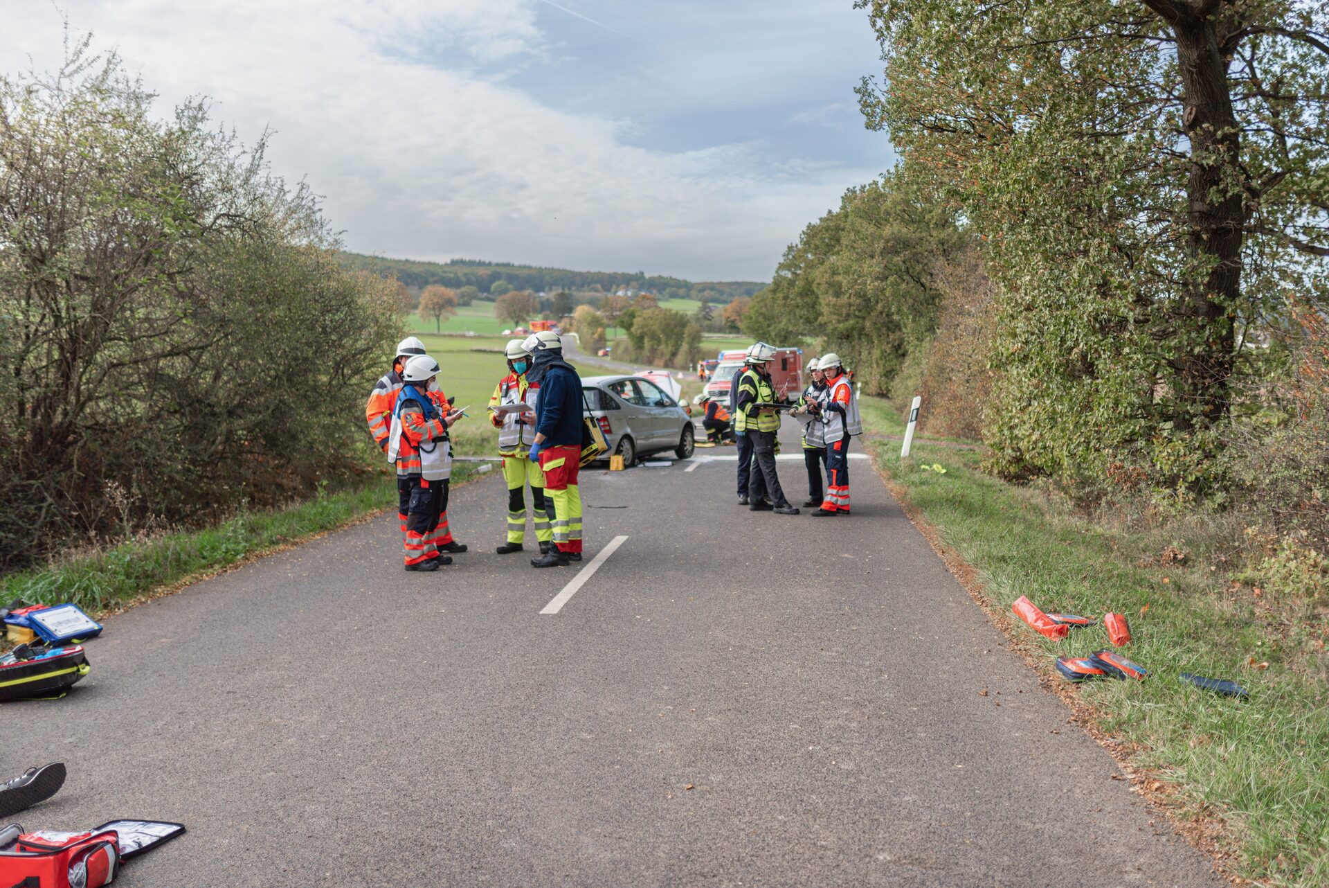 Ein sogenannter "Massenanfall von Verletzen" wurde geprobt, also ein Unfall mit vielen Opfern. Bei dem Szenario ist ein Auto in eine Gruppe von Wanderern gerast. Im Rahmen der Notfallübung war die Kommunikation zur Leitstelle, die Organisation vor Ort und die Zusammenarbeit mit den beteiligten Organisationen sehr wichtig, um die insgesamt 14 Verletzten bestmöglich zu versorgen. Die Patienten wurden von Notfallsanitäter-Schülerinnen und -Schülern des Notfallbildungszentrums gespielt, die jeweils eine Karte mit ihren Verletzungen an sich befestigt hatten. Kopfplatzwunde, abgetrennter Arm, starke Bauchschmerzen oder auch Prellungen waren mögliche Hinweise für die Rettungskräfte, um den medizinischen Zustand einschätzen zu können und entsprechend zu handeln.