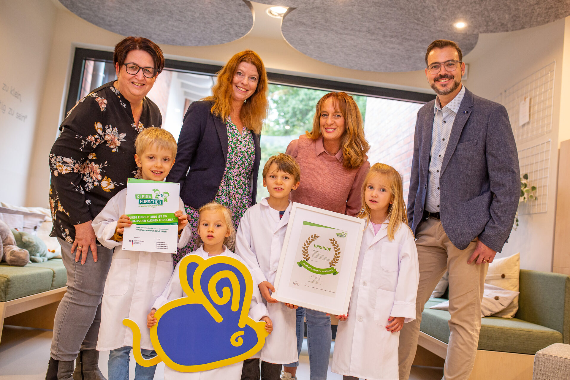 Christoph Siebertz (Vorstand Kreismäuse), Kita-Leiterin Claudia Mürkens, Stephanie Wentz (pädagogische Leitung) und Erzieherin Kerstin Krieger (v.r.) freuen sich mit den Kindern über die Auszeichnung als "Haus der kleinen Forscher".