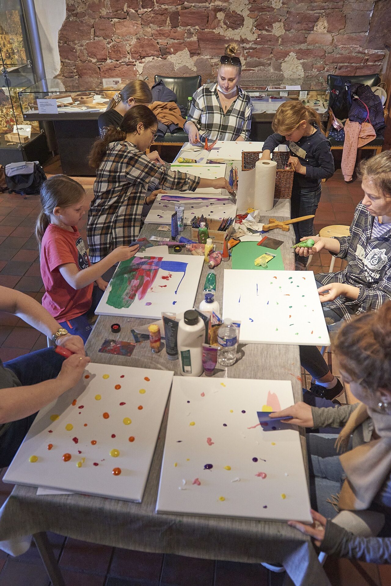 Vom Mittelalter geht es dann weiter in das Hier und Jetzt. Welche Farben des Sommers gibt es? Im Außenbereich der Burg können sich die kleinen Künstlerinnen und Künstler wunderbar inspirieren lassen, welche Farben es in der Natur gibt und wie das Blau des Himmels und das Gelb der Sonne erstrahlen. Dabei werden große Keilrahmen nach der gewonnenen Inspiration bemalt. Der Kreativität sind hierbei keine Grenzen gesetzt! Unter anderem können z.B. Softbälle in Farbeimer getaucht und auf die Bilder geworfen werden - ein anderes Erlebnis als mit Pinseln zu malen!