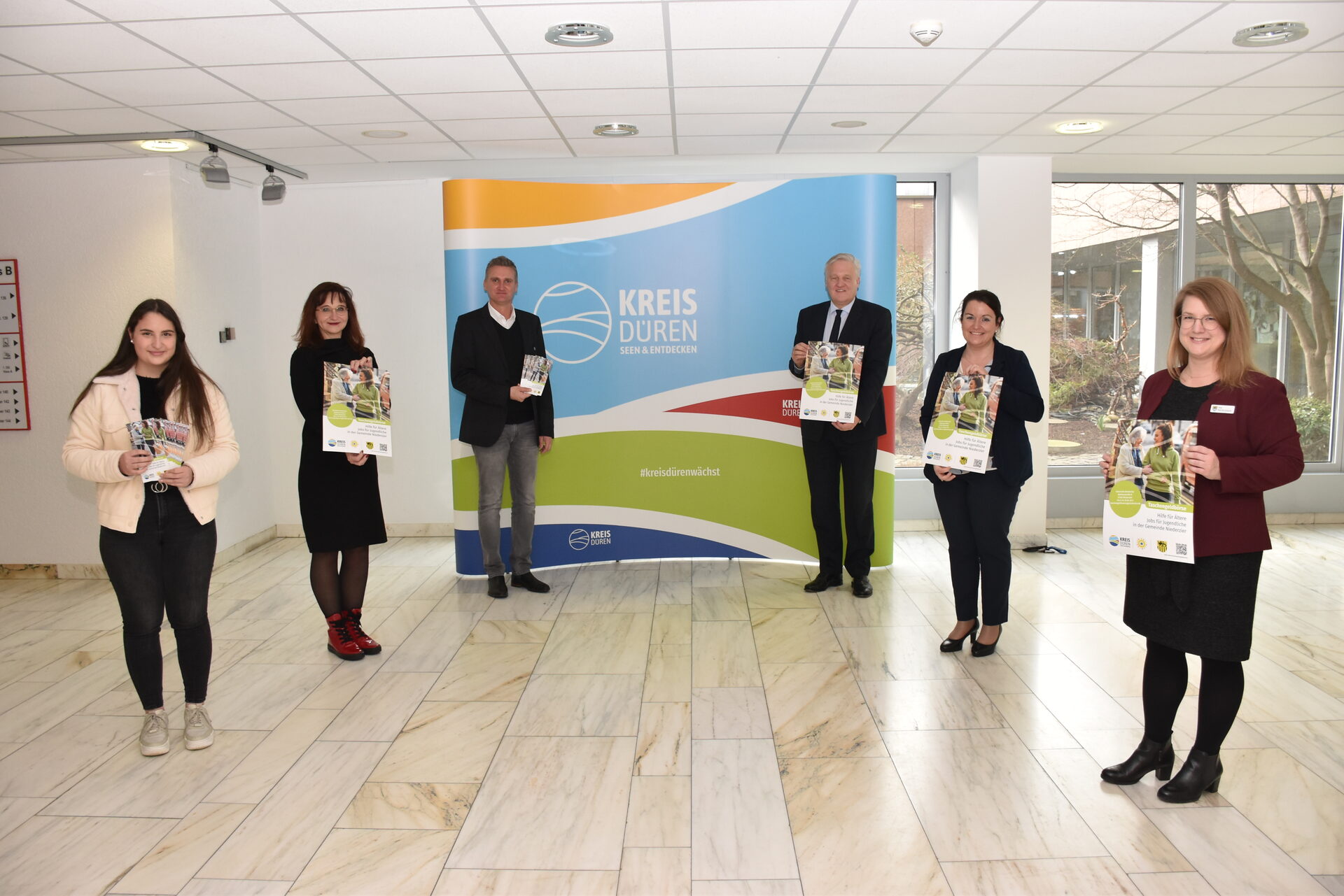 Die Taschengeldbörse ist nun auch in Niederzier. Hoffen auf eine rege Beteiligung: Anja Kaldenbach (Projektkoordinatorin der Taschengeldbörse, Kreis Düren), Eva Bozkir (Leiterin Stabsstelle für Demografie, Familie und Integration, Niederzier), Landrat Wolfgang Spelthahn, Bürgermeister Frank Rombey, Elke Ricken-Melchert (Leiterin des Amtes für Demografie, Kinder, Jugend, Familie und Senioren, Kreis Düren) und Ayleen Giorgio (Ansprechpartnerin Taschengeldbörse, Niederzier) (v.r.).