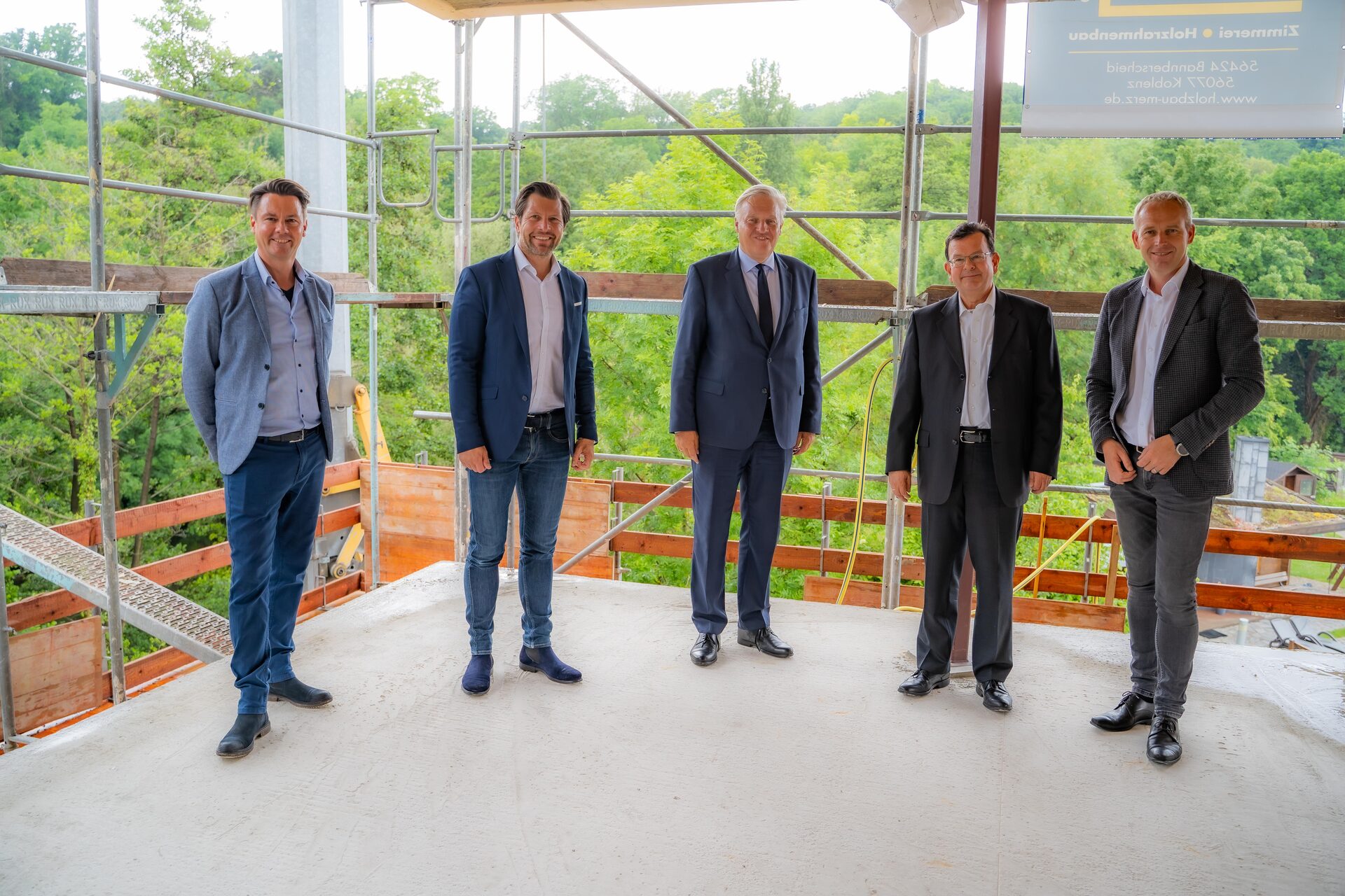 Sie freuen sich auf die Eröffnung der einzigartigen Turmsauna des Monte mare Kreuzau (v.l.): Betriebsleiter Julian Teubler, monte mare-Geschäftsführer Patrick Doll, Landrat Wolfgang Spelthahn, Freizeitbad Kreuzau-Geschäftsführer Joachim Deutz und Sven Drewlo, Geschäftsführer des Architekturbüros suoluto plan.