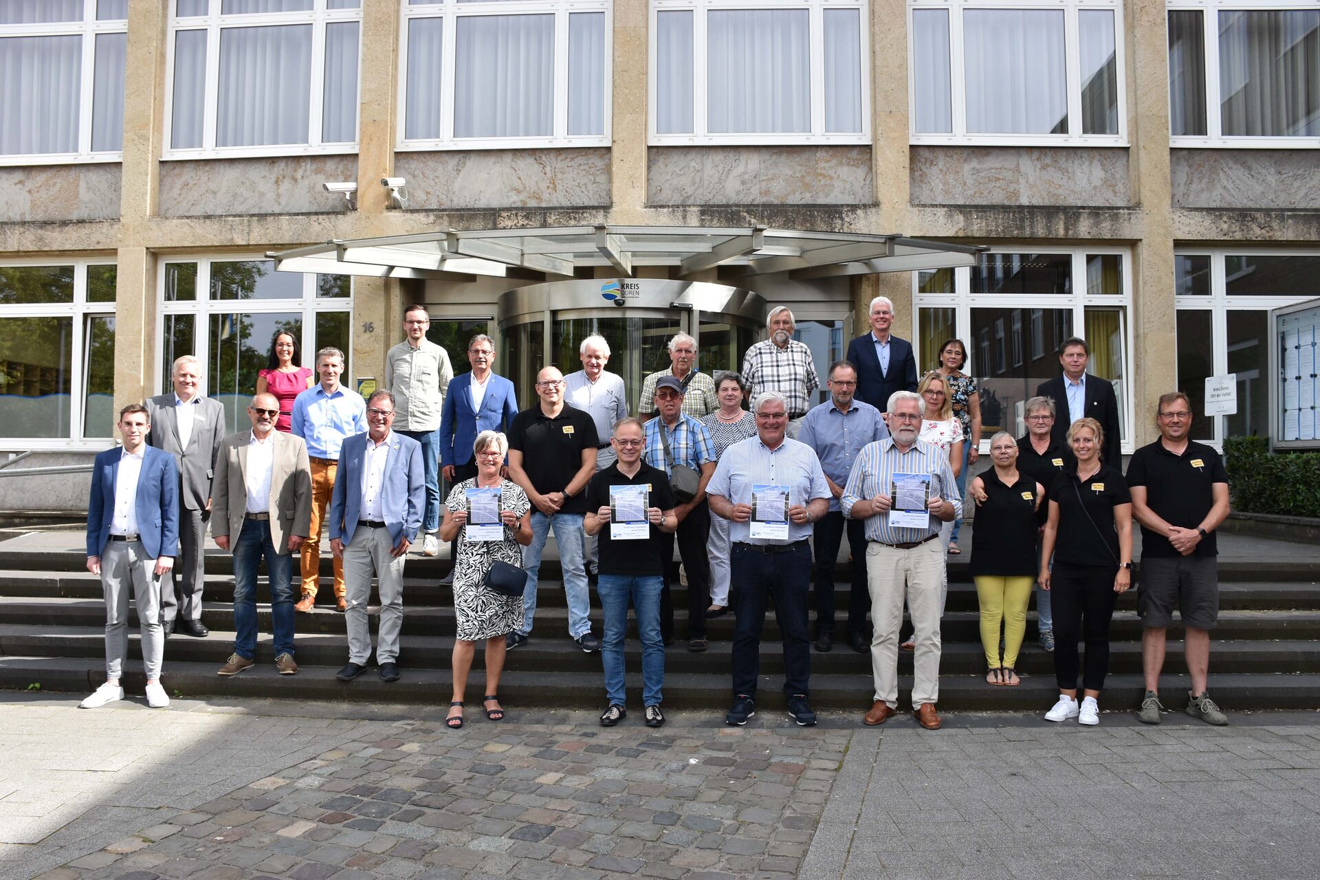 Landrat Wolfgang Spelthahn (2.v.l.) mit den Gewinnerinnen und Gewinnern des Wettbewerbs "Vereine fürs Klima" sowie den Wettbewerbsorganisatoren aus dem Kreis Düren und den Bürgermeistern und Ortsvorstehern der Heimatgemeinden der Vereine.