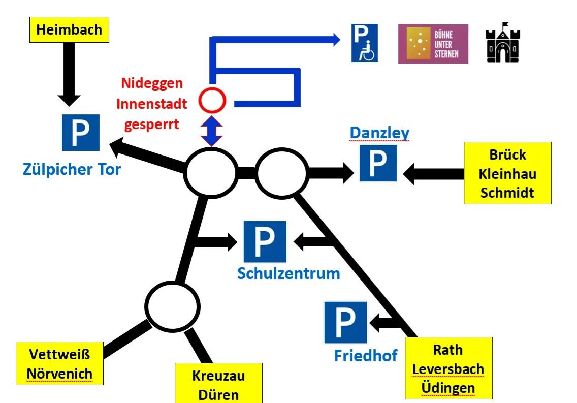 Für die Anreise wird empfohlen, mit den öffentlichen Verkehrsmitteln der Rurtalbus und Rurtalbahn anzureisen. Für die Anreise mit Auto sind nur ausgewiesene öffentliche Parkplätze verfügbar, Ordnungskräfte leiten den Verkehr und stehen bei Fragen gerne zur Verfügung. Ein Parken vor der Burg ist nicht möglich. Eine Anreise mit dem Auto direkt vor die Burg ist nur für Menschen mit Behinderung möglich. Dort steht eine begrenzte Anzahl von Parkplätzen für Inhaber des entsprechenden Parkausweises zur Verfügung. Weitere Infos und Karten gibt es auch auf www.buehne-unter-sternen.de (Öffnet in einem neuen Tab).