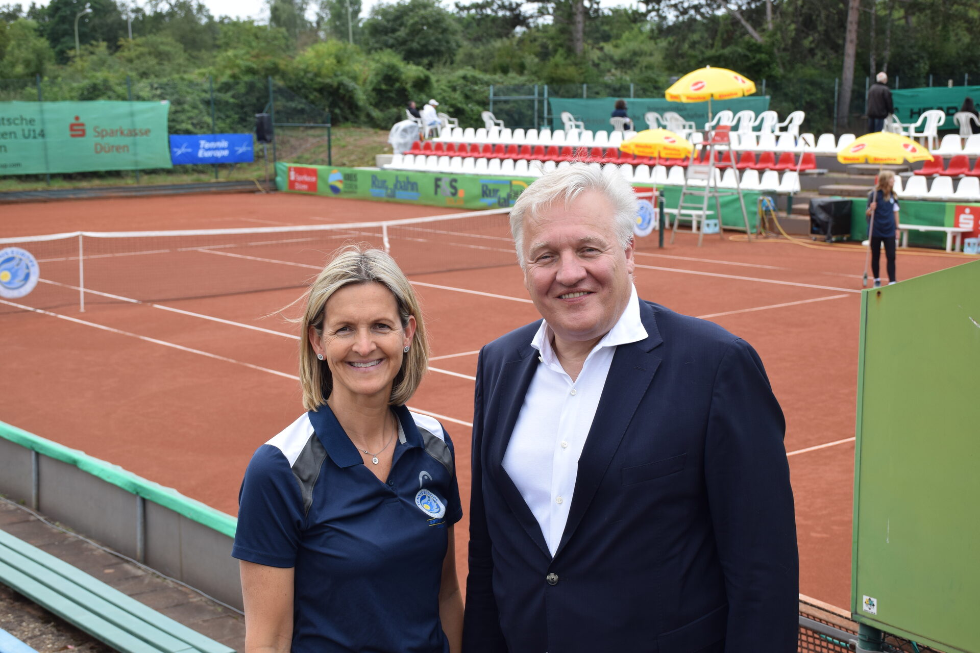 Landrat Wolfgang Spelthahn mit Martina Klein, Vorsitzende des Fördervereins Tennis Jüngsten Cup, zu Besuch auf dem Spielgelände.