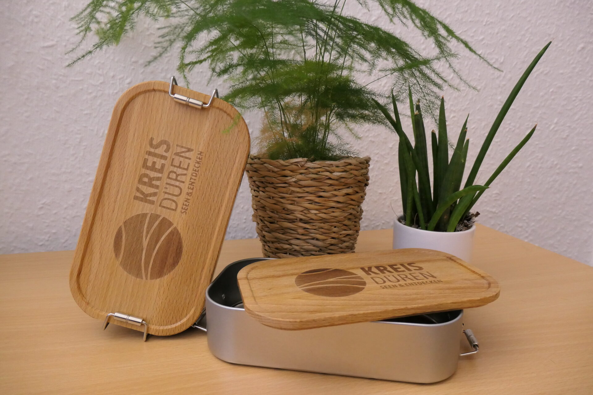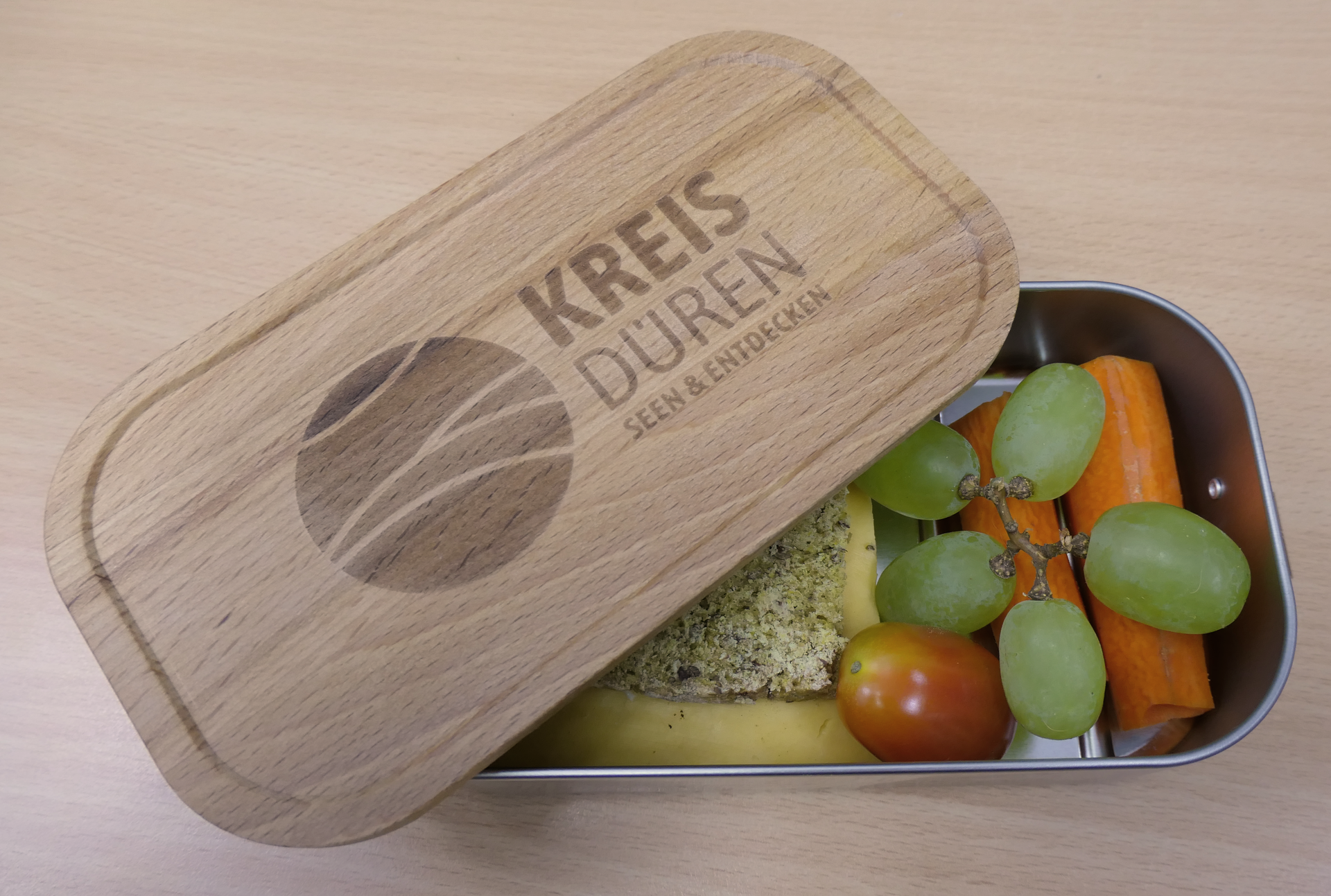 Die nachhaltigen Brot- und Frischhaltedosen bestehen aus Weißblech und haben einen verschließbaren Deckel aus Buchenholz mit einem eingravierten Logo des Kreises Düren. Sie stellen eine umweltfreundliche Alternative zu den üblichen Einwickelfolien dar und enthalten im Gegensatz zu wiederverwendbaren Plastikdosen keine gesundheitsschädigenden Weichmacher. Außerdem tragen sie dazu bei, dass in privaten Haushalten weniger Müll anfällt, da sie bei Einkäufen die Umverpackungen ersetzen können. Die Brotdosen haben ein Fassungsvermögen von 700 ml und bieten genügend Platz für Butterbrote und andere Pausensnacks (Maße: 175 x 95 x 45 mm).
