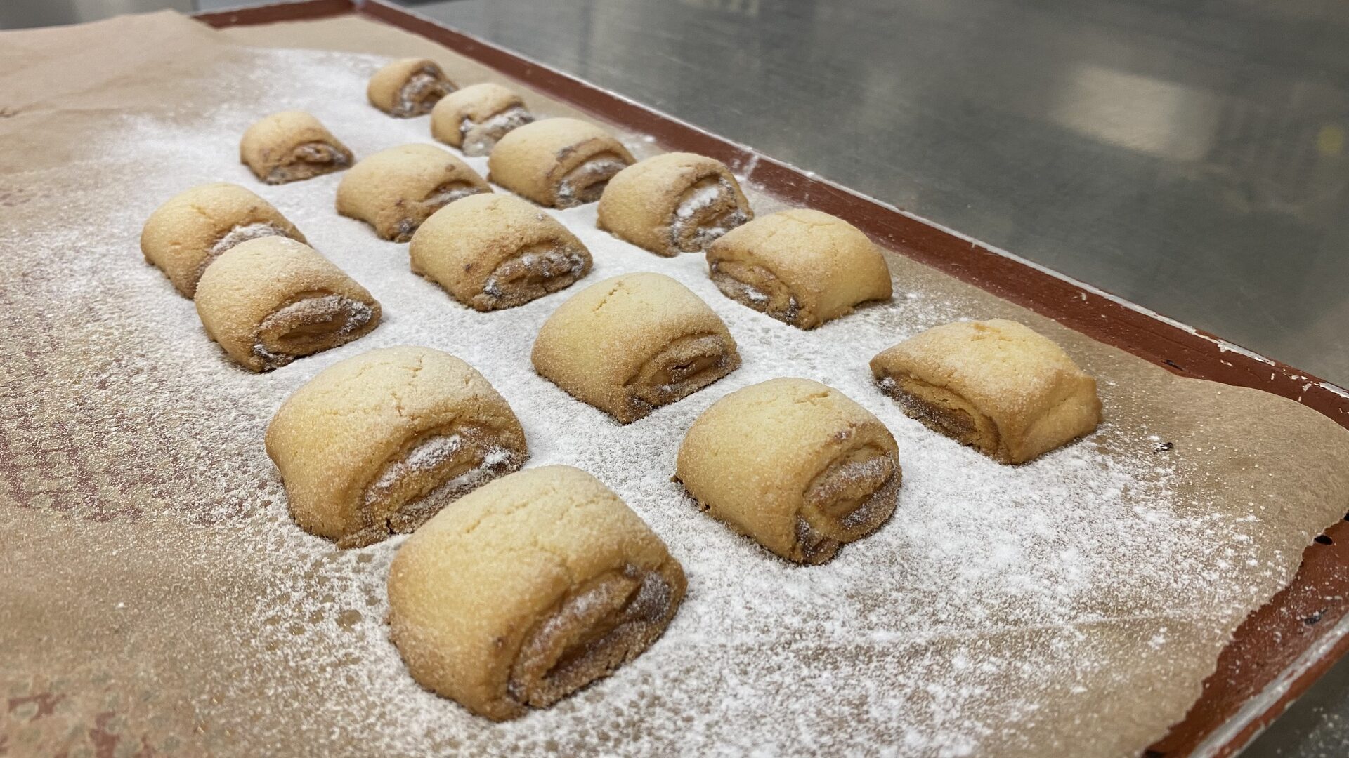 Den Teigstreifen der Länge nach aufrollen, in gewünschte Breite schneiden und die so Portionierten Kissen auf ein mit Backpapier ausgelegtes Backblech legen.