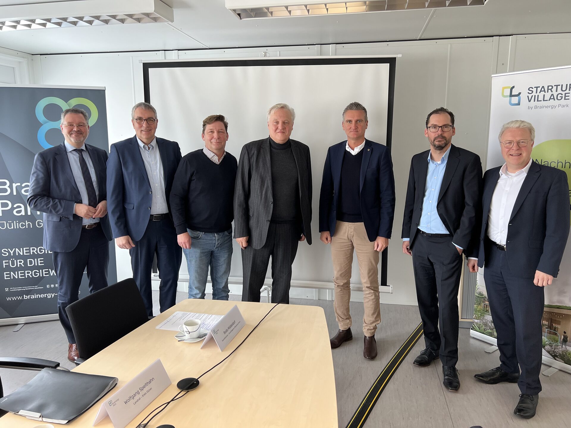 Stellten die Pläne für den Brainergy Park vor: Bodo Middeldorf, Zukunftsagentur Rheinisches Revier, Jürgen Frantzen (Bürgermeister von Titz), Axel Fuchs (Bürgermeister Jülich), Landrat Wolfgang Spelthahn, Frank Rombey (Bürgermeister Niederzier) und die Geschäftsführer der Brainergy Park GmbH Frank Drewes und Prof. Dr. Bernhard Hoffschmidt (v.l.)..