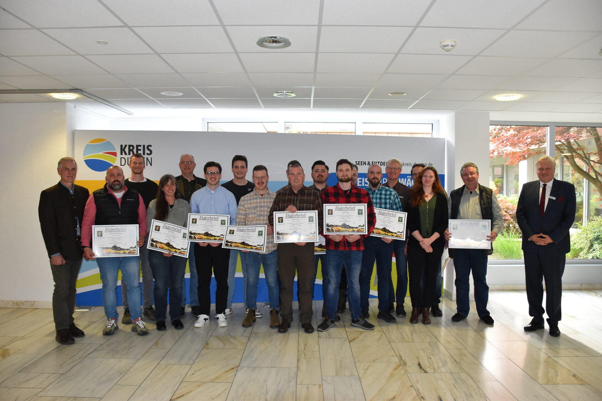Die Übergabe der Jägerbriefe wurde im Kreishaus gebührend mit Ehren-Fanfaren und einem gemeinsamen Essen gefeiert. Landrat Wolfgang Spelthahn und Andreas Dering, Vorsitzender der Kreisjägerschaft Düren e.V., überreichten den neuen Jägerinnen und Jägern ihre Jägerbriefe, die ihnen nun als Voraussetzung für einen Jagdschein dienen. Dieser wird nach intensiver Prüfung von der Unteren Jagdbehörde des Kreises Düren ausgestellt.