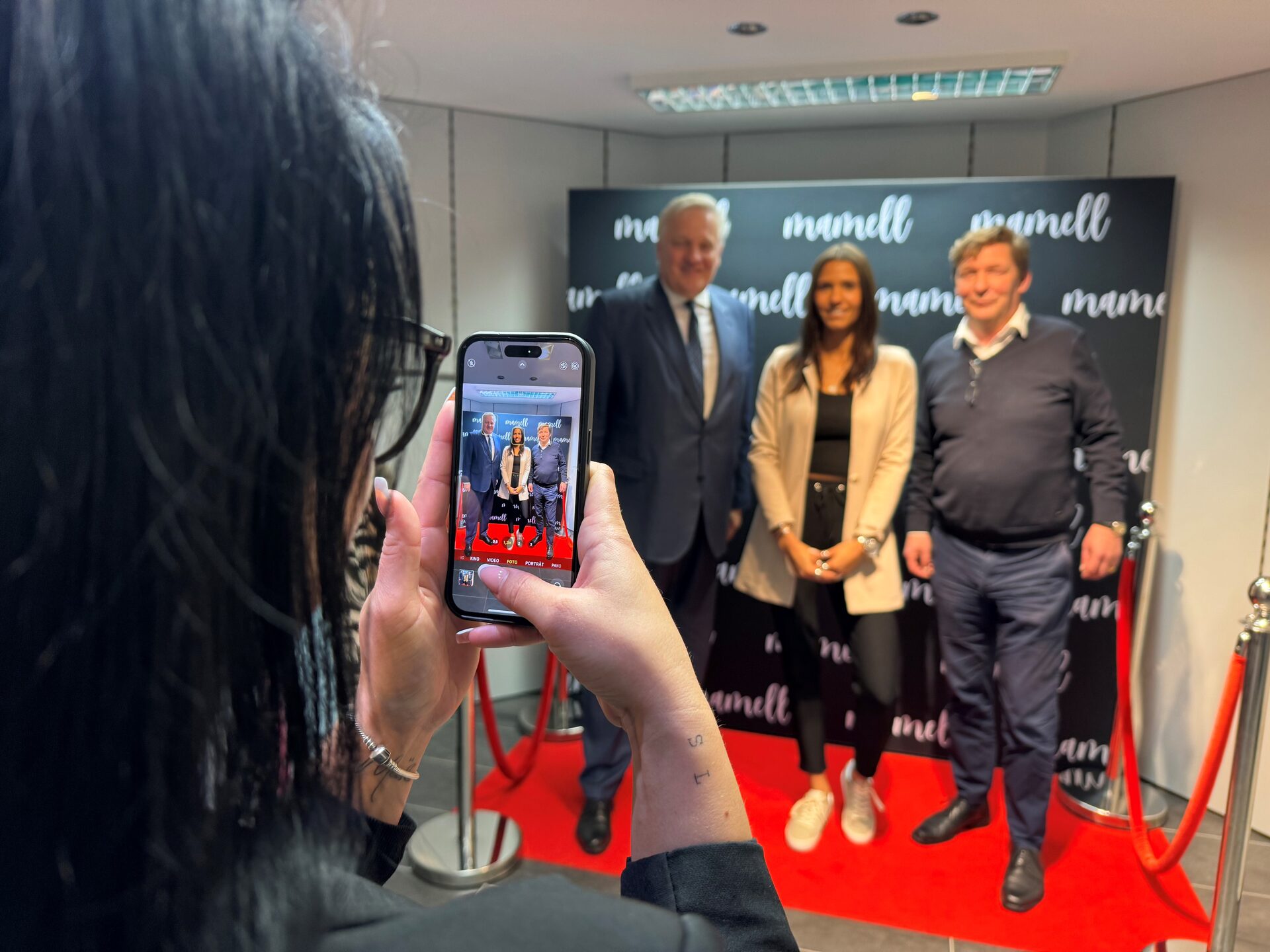 Ohne Social Media wäre der Erfolg nicht möglich: Landrat Wolfgang Spelthahn, Melanie Schneppershoff und Bürgermeister Axel Fuchs (v.l.) vor der Medienwand mit rotem Teppich im Geschäft.