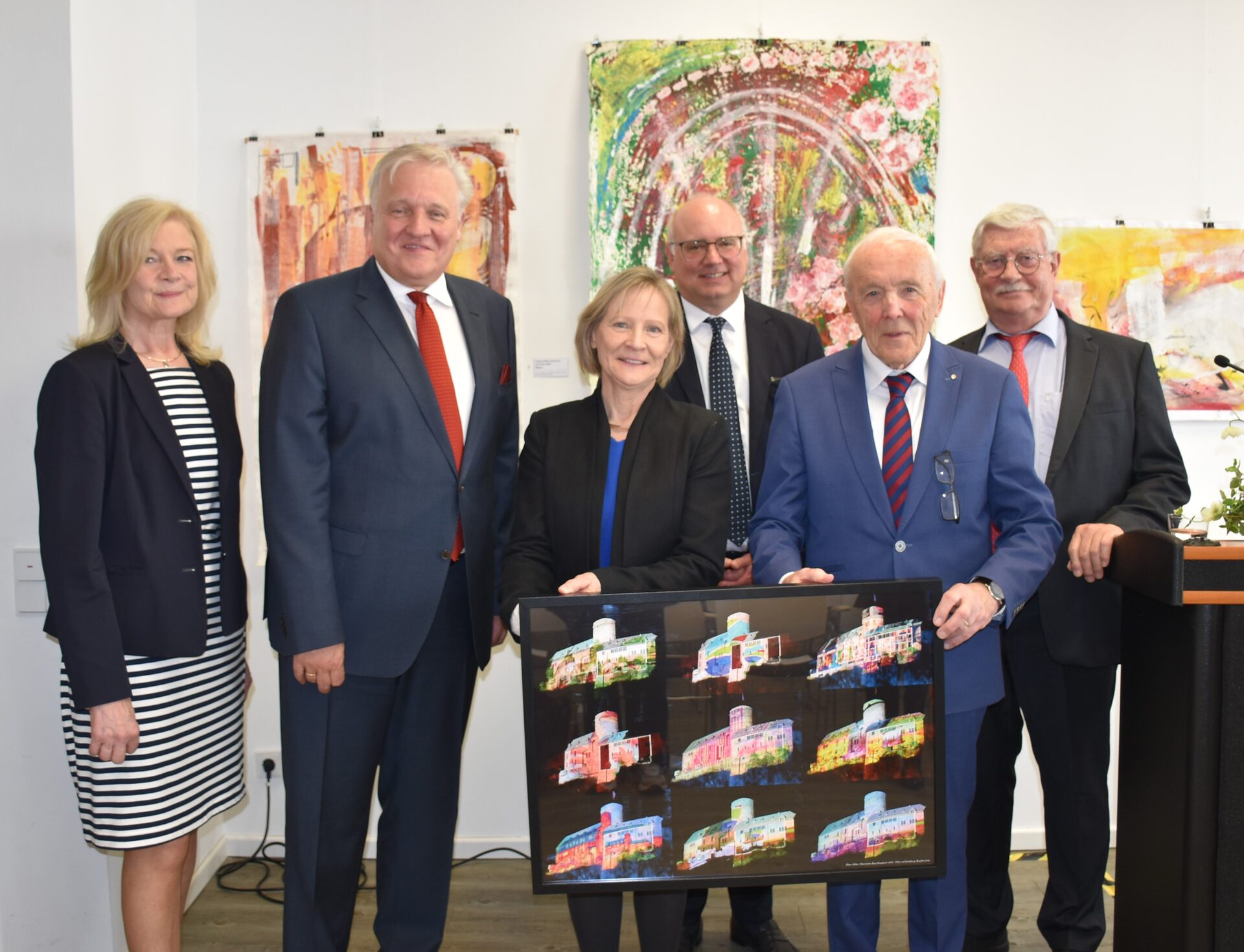 In Heimbach wurde der Abschied des Leiters der Internationalen Kunstakademie Heimbach, Prof. Dr. Frank Günter Zehnder (2.v.r.), gebührend gefeiert. Margareta Ritter (Bürgermeisterin der Stadt Monschau), Landrat Wolfgang Spelthahn, Jochen Weiler (Bürgermeister der Stadt Heimbach) und Hermann J. Weingartz (Vorsitzender des Fördervereins der Internationalen Kunstakademie Heimbach) dankten Prof. Dr. Zehnder und seiner Ehefrau (Mitte).