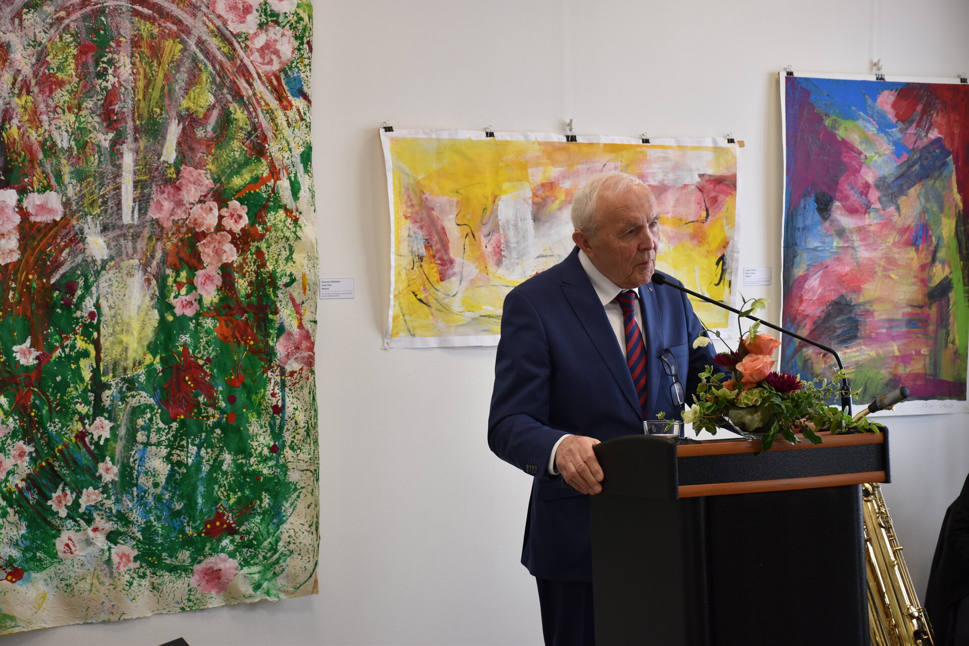 Landrat Wolfgang Spelthahn, der Vorsitzende des Trägervereins Internationale Kunstakademie Heimbach, eröffnete die Feier: "Die zahlreichen Anwesenden zeigen die große Wertschätzung gegenüber Prof. Dr. Zehnder, der sein Wissen und seine Empathie für die Kunst mit tausenden Menschen geteilt hat. Er ist ein vor Kreativität sprühender Mensch und er hat es geschafft, dass die Internationale Kunstakademie Heimbach fest im Kulturleben des Kreises Düren sowie der gesamten Region verwurzelt ist. Hier wird jede und jeder Kunstschaffende gefördert — das ist der gelebte Kern." Der Landrat präsentierte die Hintergründe sowie Entstehungsgeschichte der Kunstakademie auf der Burg Hengebach. "Die Akademie ist ein Ort der Begegnung. Kunst muss frei und international sein. Kunst steht für Toleranz, Miteinander und Weltoffenheit. Hier sind alle Menschen gleich", so Landrat Wolfgang Spelthahn.