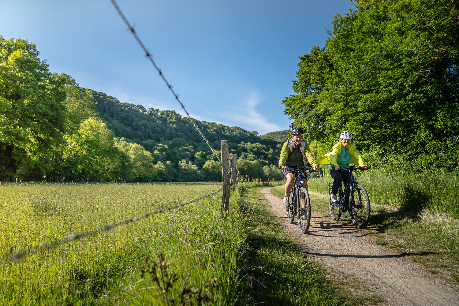 Wer es über Stock und Stein gemächlicher angehen lassen möchte, genießt eine der vielen ausgeschilderten MTB-Rundkurse der "Freifahrt Eifel" - die Panoramaschleife zum Beispiel, den Seeblick oder die Felsen-Rundfahrt.