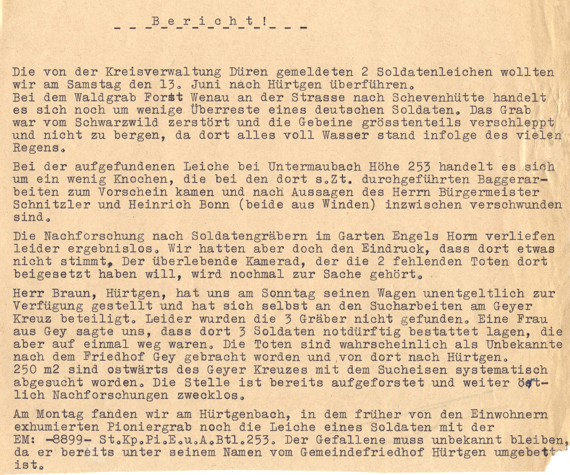 Die meisten dieser Gräber erwiesen sich als Provisorien. Denn die Errichtung der beiden großen Kriegsgräberstätten in Hürtgen und Vossenack ermöglichten es später, die sterblichen Überreste der Kriegstoten zentral zu bestatten. Das führte seit Ende der 1940er-Jahre zu zahlreichen Umbettungen. Der undatierte Bericht verdeutlicht die Schwierigkeiten, die sich bei der Auffindung und Identifizierung der Toten häufig ergaben.