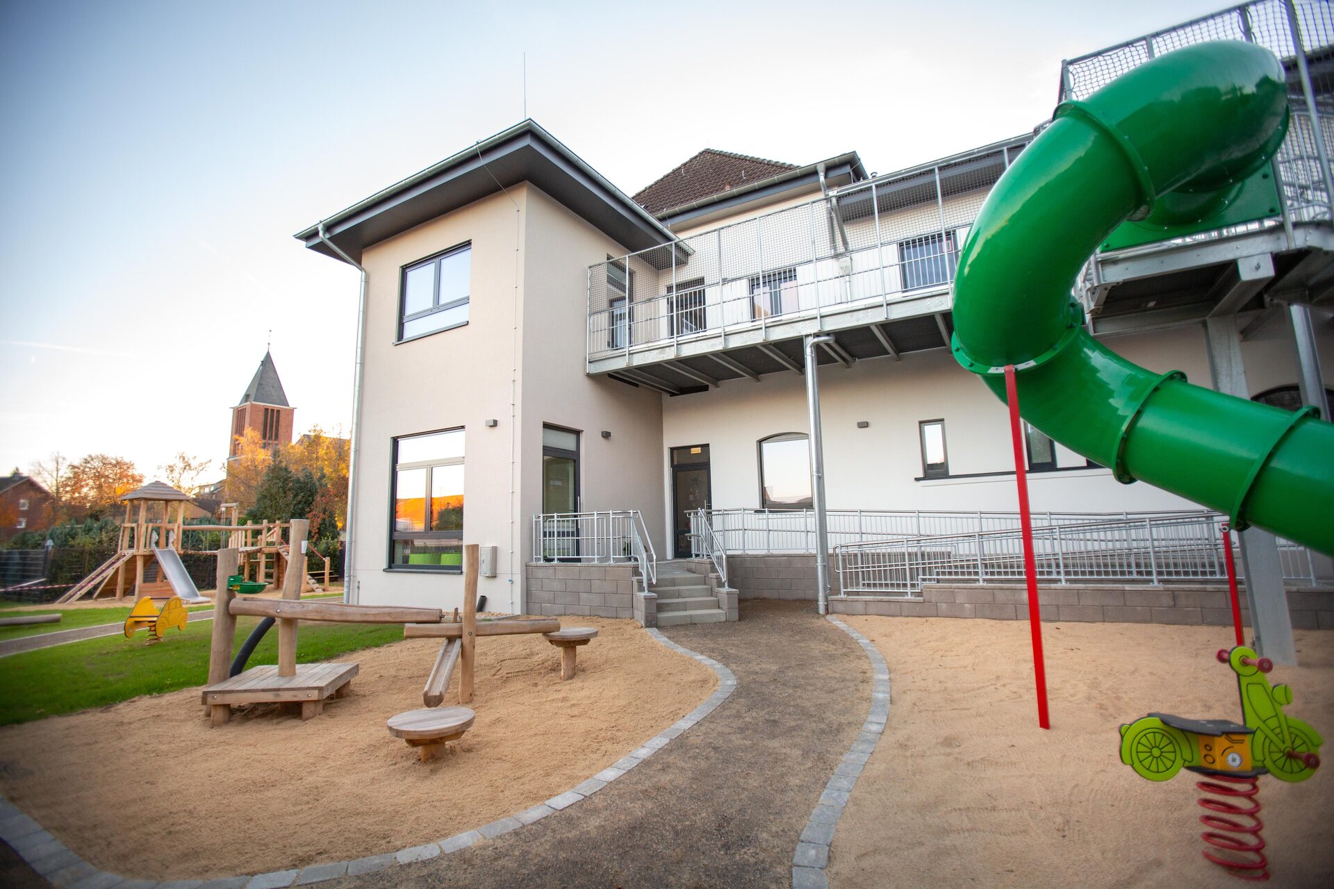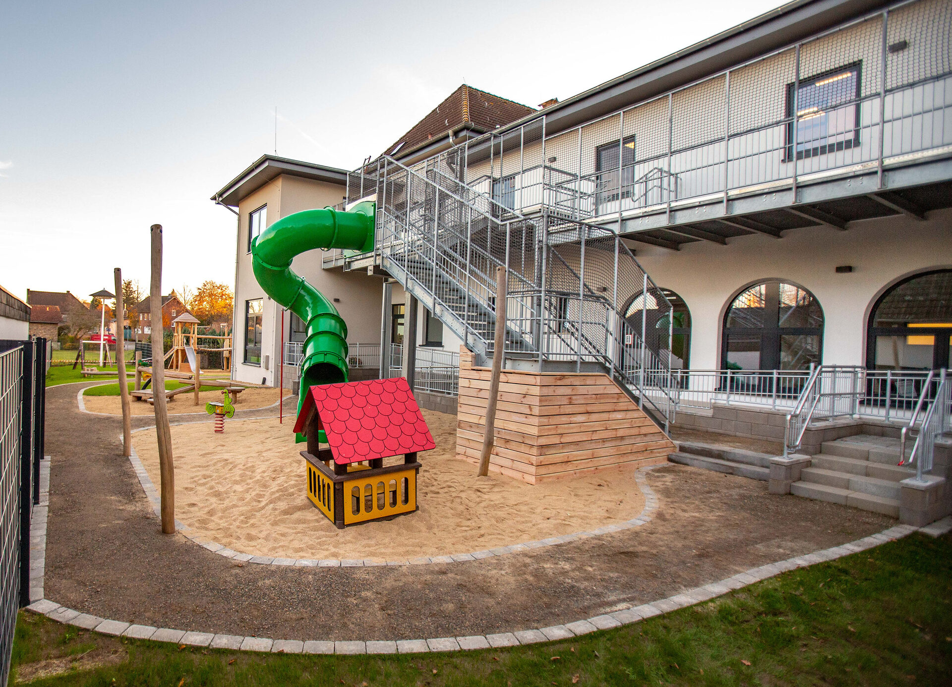 Unser Grundstück verfügt im vorderen Bereich der Einfahrt über Parkplätze für Eltern und Besucher. Das neu angelegte Außengelände erstreckt sich im hinteren und seitlichen Teil des Grundstückes. Jede Gruppe besitzt einen eigenen Zugang zum Außengelände. Die Bewegungs- und Spielelemente sind sowohl für U3- als auch für Ü3-Kinder geeignet und sind eine Mischung unterschiedlichster Bewegungsformen. Hierbei erhalten die Kinder die Gelegenheit, sich neue Fähigkeiten wie Klettern, Balancieren etc. anzueignen und das Bestehende zu fördern.