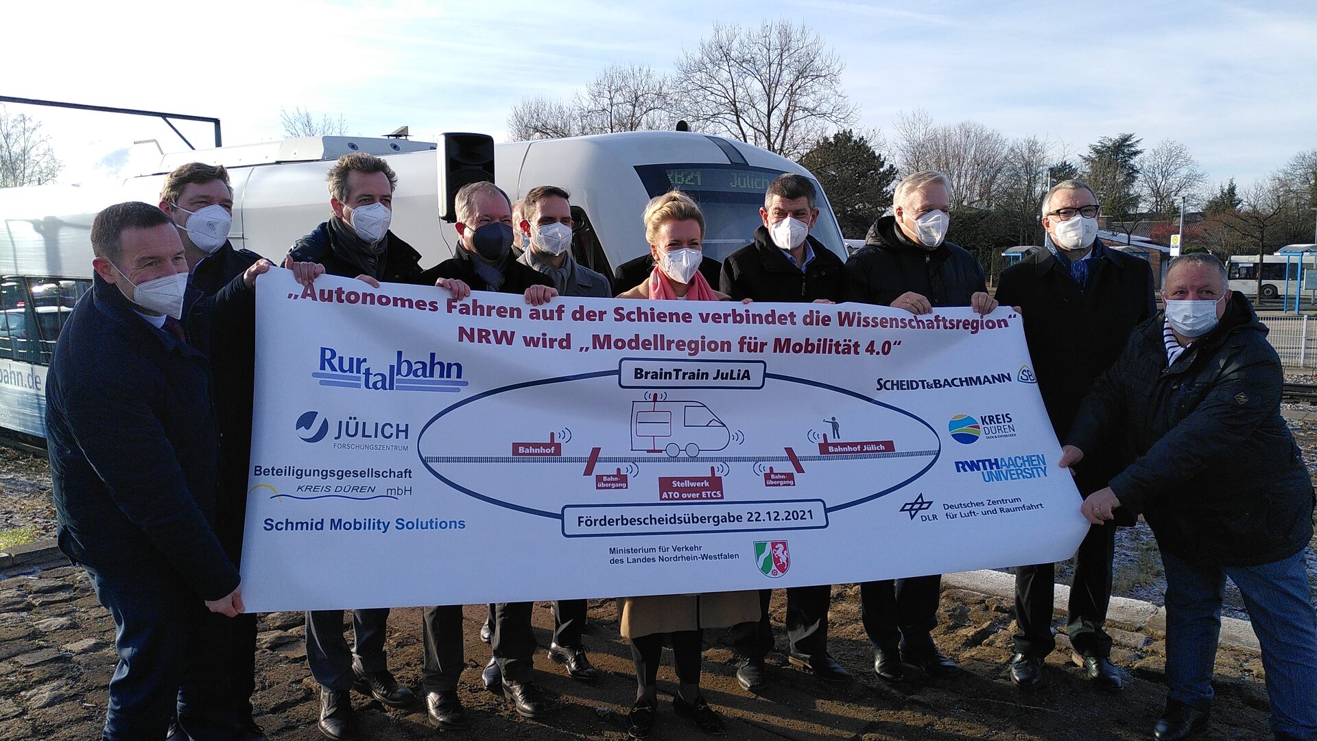 Autonomes Fahren ist die Zukunft, ob im Auto oder im Zug: NRW-Verkehrsministerin Ina Brandes übergab gestern (22.12.) am Bahnhof in Jülich einen Förderbescheid von gut einer Million Euro für den so genannten Brain Train JuLiA, der zwischen Jülich und Linnich erprobt werden soll. Auf einer Strecke von zehn Kilometern erforscht das Projekt intelligente Lösungen für selbstfahrende Züge: von teilautomatisiert, also mit einem Operator an Bord, bis voll autonom.