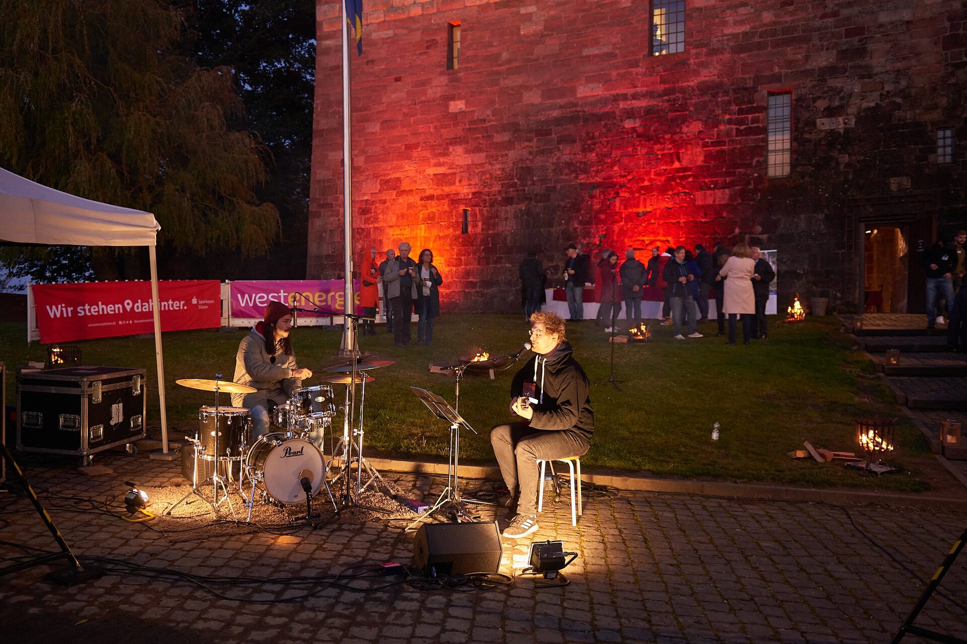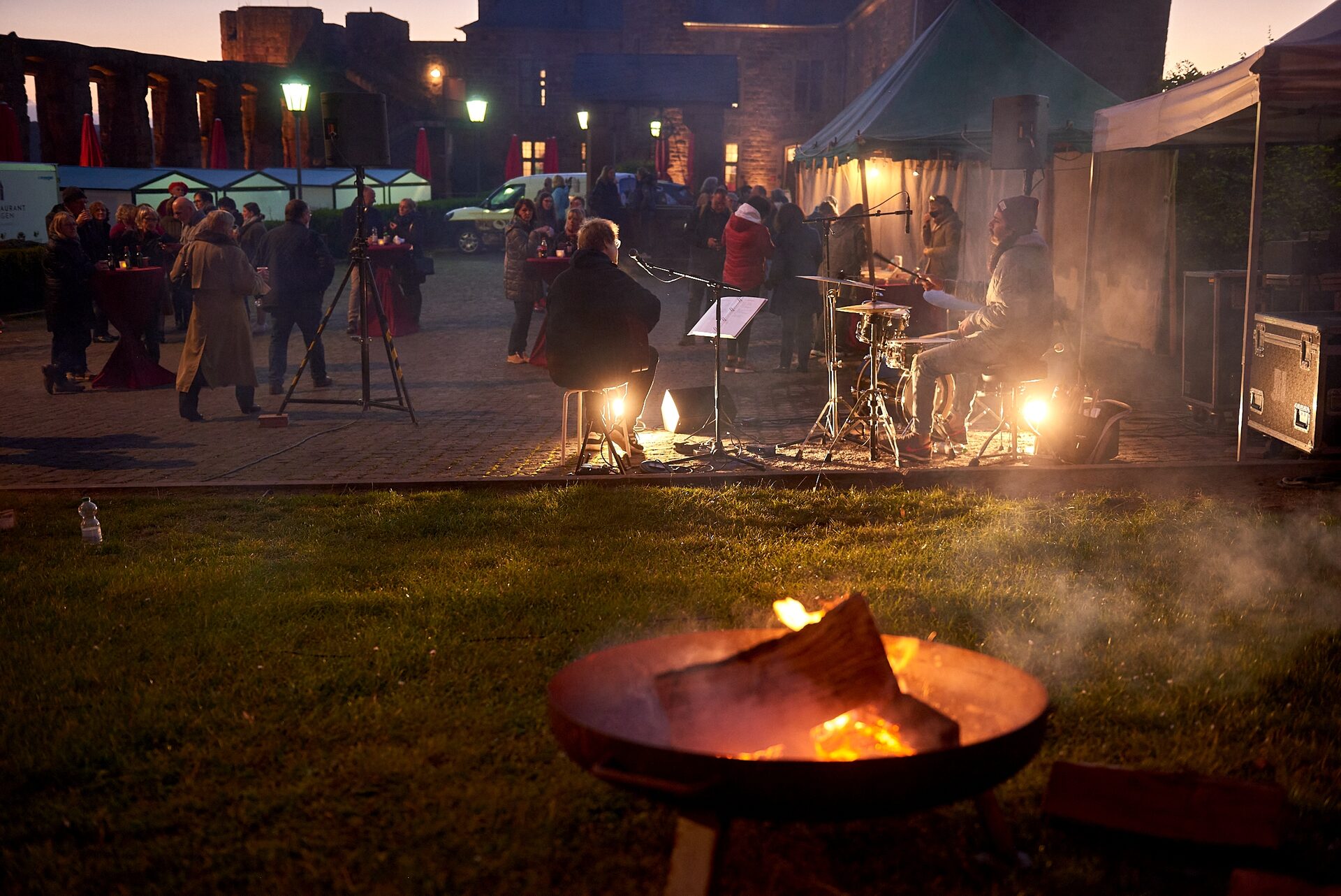 Ab 19 Uhr konnten die gespannten Besucher die Burganlage über einen mit Fackeln gesäumten Weg betreten. Im Burghof erwarteten die Gäste Lagerfeuer, ein stimmungsvolles musikalisches Duo unter der Leitung von Bernhard Gerards, eine Outdoor-Bar mit Getränken und Snacks sowie ein gut bestückter Büchertisch der Buchhandlung Lesezeichen aus Kreuzau. Nachdem alle Krimifans in „ihre“ Gruppe eingeteilt worden waren, konnte es mit dem Mord(s)vergnügen los gehen. Die vier namhaften Autoren Ulrike Bliefert, Eva Maaser und das Autorenduo Uwe Wilhelm und Martin Lutz hatten je eine halbe Stunde, das Publikum in ihrem jeweils ganz eigenen Bann ihrer Bücher zu ziehen. Jede Gruppe besuchte jede Autorenlesung.