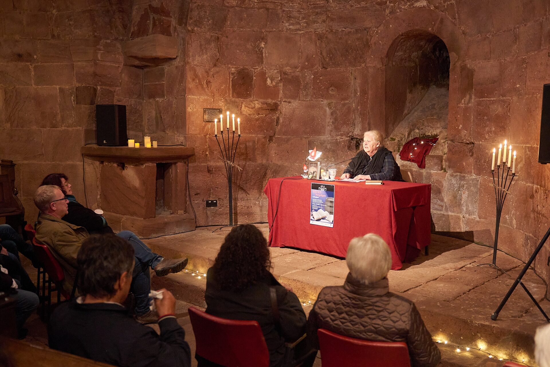 In der stimmungsvollen Burgkapelle der Burg Nideggen, direkt neben dem Kerker, konnten die Krimi-Fans schließlich der mit zahlreichen Dialekten gespickten Stimme von Schauspielern und Autorin Ulrike Bliefert lauschen. Mit ihrem Kriminalroman „Der Tod der Schlangenfrau“ entführte sie das begeisterte Publikum in das Berlin des 20. Jahrhunderts. Bei ihrem Eintreffen im Bergfried sagte die Schauspielerin, dass sie aus Pandemie-Gründen eine Anfrage für einen Tatort-Dreh abgesagt hätte, aber als ihre Agentin ihr von der Anfrage zum "MordsVergnügen" berichtete, stand ihre Zusage sofort fest. Das Ambiente dieser Veranstaltung wollte sie nicht verpassen. Ulrike Bliefert war zum zweiten Mal dabei. Vor zwei Jahren hatte sie aus: "Die Samariterin" gelesen.