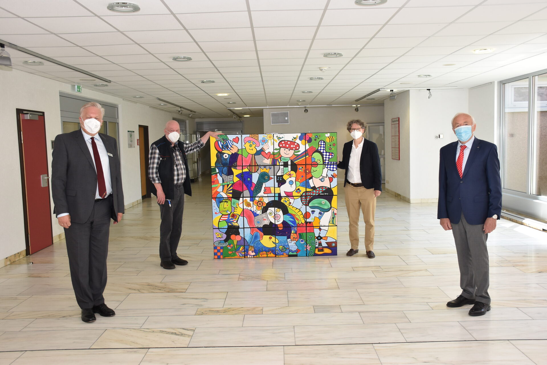 „Ich freue mich sehr über das wirklich außergewöhnlich tolle Bild, das den Familien viel Freude bringen soll. Wir sagen von Herzen ‚Danke‘“, betont Dr. Matz. „Es ist ein besonderes Kunstwerk geworden“, sagt Otmar Alt. Zusammen mit dem Direktor der Internationalen Kunstakademie Heimbach, Prof. Frank Günter Zehnder, übergab er das Bild. „Die Herausforderung ist die Korrespondenz der einzelnen kleineren Bilder, die später ein großes Ganzes ergeben. Daraus ist eine wunderbare, kraftvolle Gemeinschaftsarbeit entstanden.“ Die Binnenstruktur, die Feinheiten von Erzählung und Farbe, von realistischen oder abstrakten Formen wurden von den Teilnehmern individuell erfunden und gestaltet. Auch Landrat Wolfgang Spelthahn freut sich bei der Übergabe über den zukünftigen Platz des Bildes. „Es ist Kunst aus dem Kreis Düren für die Menschen im Kreis Düren. Das Bunte und Vielfältige im Bild spiegelt auch das Leben im Kreis wider.“