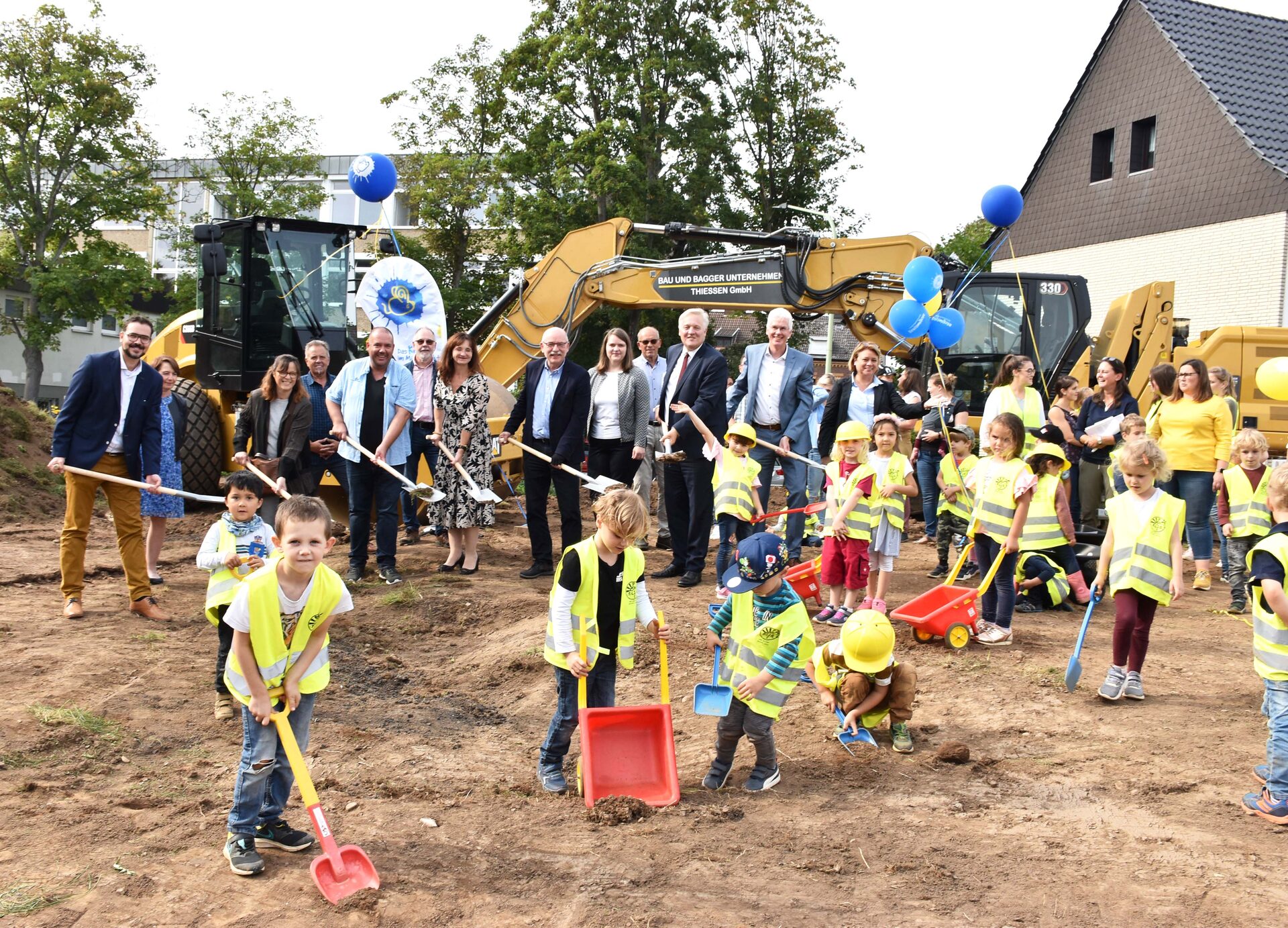 Die Kita ist auf dem besten Weg, eine Bewegungskita zu werden. Unterstützung gibt es hierbei vom Kreuzauer Turnverein sowie dem Kreissportbund. "Ich freue mich, dass wir heute gemeinsam den Baubeginn feiern können und viele Kinder in dieser tollen Umgebung Spaß haben werden", sagte Bürgermeister Ingo Eßer. Bevor die Schaufeln in den Boden gestochen wurden, haben die kleinen Bauarbeiter noch ein thematisch passendes Lied vom Baggerführer Willibald gesungen. Anschließend wurden noch Sonnenblumensamen an die Erwachsenen verteilt, die zu Hause die Blumen gedeihen lassen können, um sie dann gerne zur Eröffnung in voller Pracht als Einzugsgeschenk mitzubringen.