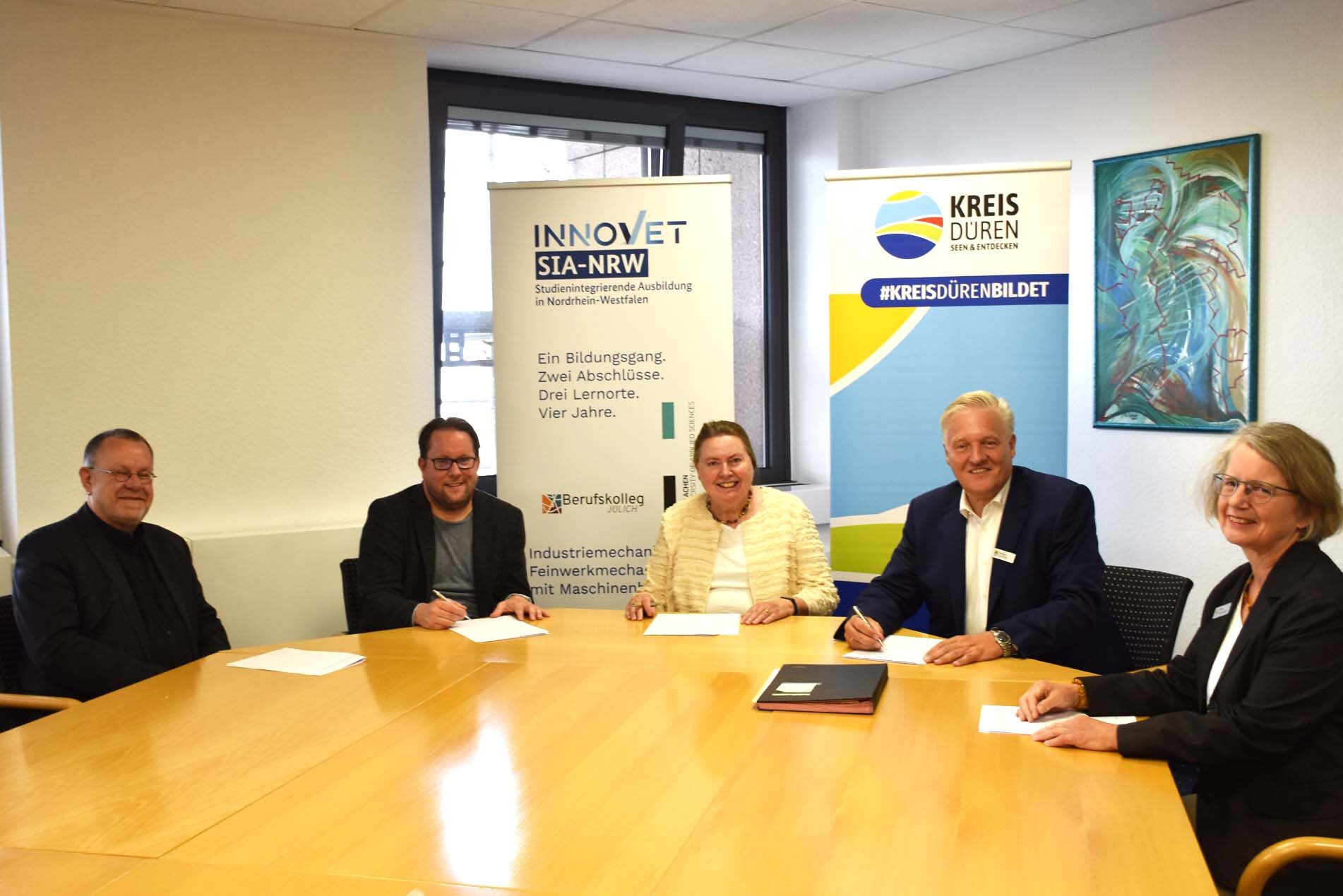 Im Rahmen des Bundeswettbewerbs „Zukunft gestalten – Innovationen für eine exzellente berufliche Bildung (InnoVET)“ wird auch die „Studienintegrierende Ausbildung (SiA-NRW)“ gefördert. Seit dem Projektstart am 13. November 2020 ist das Berufskolleg Jülich in Partnerschaft mit der FH Aachen, Campus Jülich, einer von zwei Pilotstandorten in NRW. Im kommenden Schuljahr kommen weitere neun Berufskollegs in NRW mit ihren Hochschulpartnern hinzu. "Frau Schwarzbauer war der Motor für dieses hervorragende Projekt in Jülich. Es ist ein toller Erfolg, dass es immer weiter ausgebaut wird", sagt Sybille Haußmann, Bildungsdezernentin des Kreises Düren bei der Unterzeichnung.