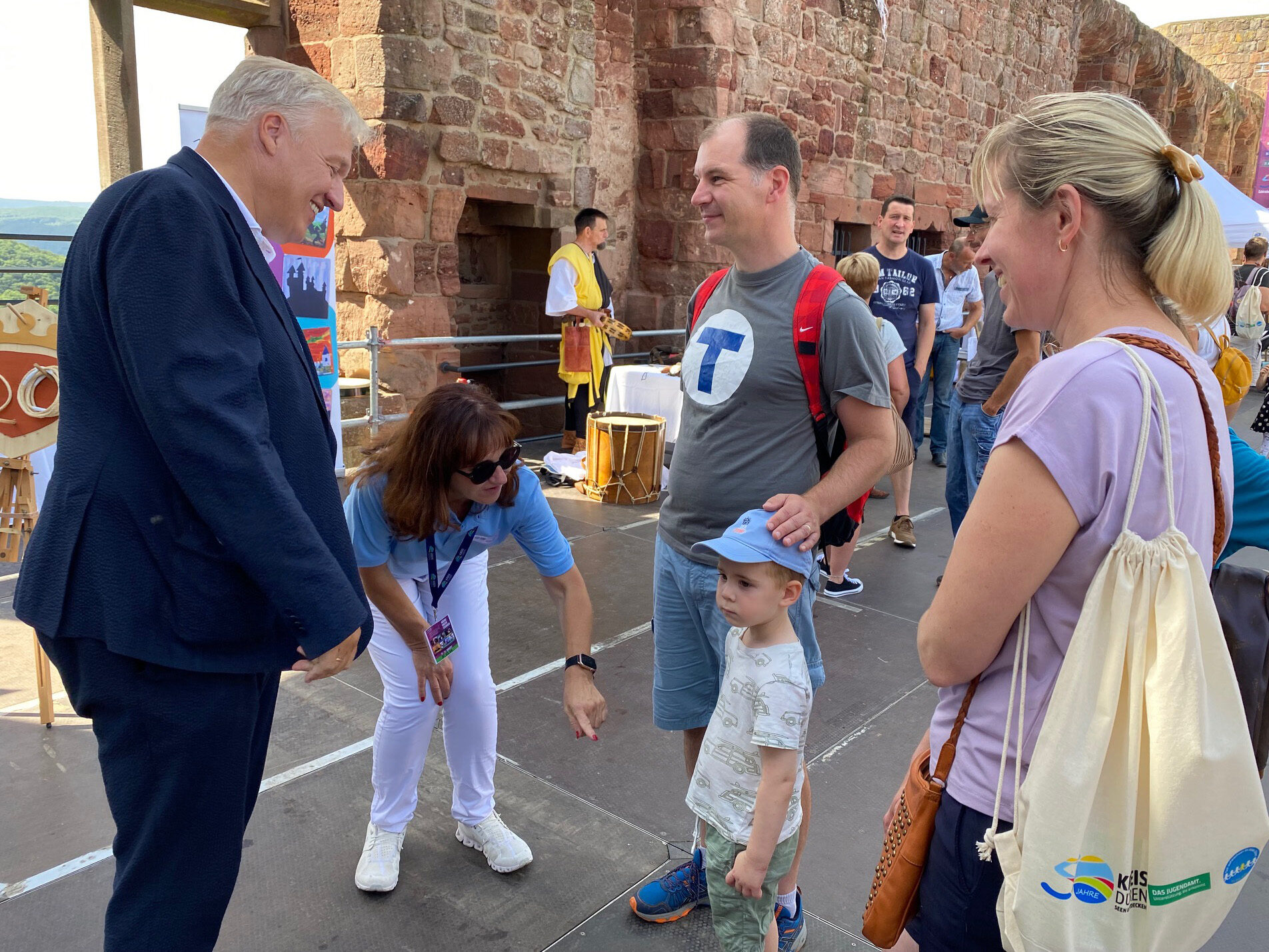 „Ich bin sehr beeindruckt, dass so viele Menschen gekommen sind und mit uns feiern. Ich blicke in zufriedene Gesichter. Es ist für jede und jeden etwas dabei“, sagte Landrat Wolfgang Spelthahn beim Rundgang über das Familienfest. Bogenschießen, Gaukler-Kunststücke, Luftballontiere, mittelalterliche Spiele, einen Blick in das Burgenmuseum, Kinderschminken, Zuckerwatte, Popcorn und vieles mehr gab es hier bei freiem Eintritt zu entdecken. An den Ständen beispielsweise des Jugendamtes des Kreises Düren oder der Kindertagesbetreuung Kreismäuse AöR (Anstalt des öffentlichen Rechts) gab es nicht nur kleine Geschenke und Mitmachaktionen, sondern auch hilfreiche Informationen und Angebote für Eltern und ihre Kinder. "Wir wollen den Familien ein schönes Fest bereiten und die vielen Angebote im Kreis Düren vorstellen", sagte Elke Ricken-Melchert, Leiterin des Amtes für Demografie, Kinder, Jugend, Familie und Senioren. Rund 50 Mitarbeiterinnen und Mitarbeiter ihres Amtes sorgten für einen reibungslosen Ablauf beim Familienfest. Am Abend gab es dann noch Konzerte von KEV, Cat Ballou und Torben Klein, die für einen runden und musikalischen Abschluss der veranstaltungsreichen Woche auf Burg Nideggen sorgten.