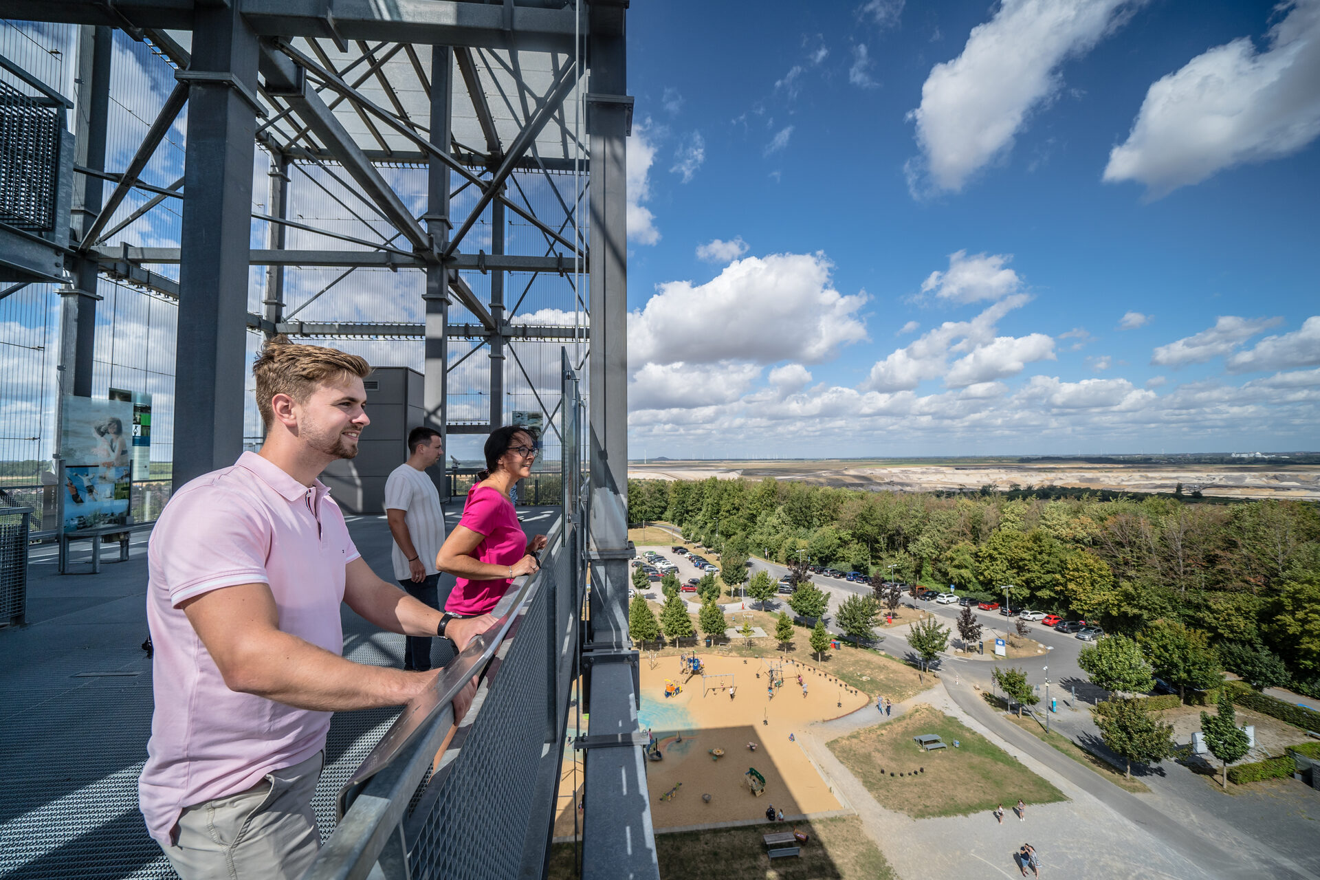 Der Indemann (eine 36 Meter hohe Stahlkonstruktion, die aus über 20.000 Einzelbauteilen besteht) steht auf der höchsten Ebene der Gemeinde, der Goltsteinkuppe. Über 216 Stufen können die zwölf verschiedenen Ebenen erreicht werden. Ein Aufzug fährt bis auf 24 Meter hinauf. Von seinen zahlreichen Aussichtsplattformen bietet sich den Besuchern ein spektakulärer Rundblick auf den noch aktiven Tagebau. Am Edelstahlgewebe, welches die Konstruktion umschließt, ist mit der Firma GKD Gebrüder Kufferath sogar eine Firma aus Düren beteiligt gewesen.