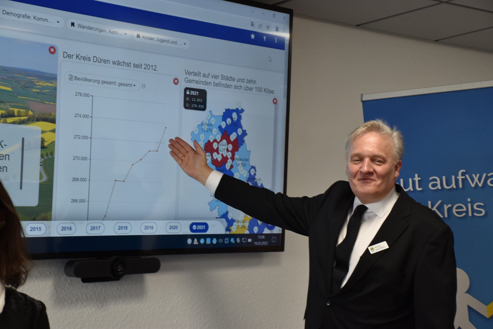 So leiteten die Schülerinnen und Schüler ab, dass es auch mehr und gepflegtere Sportanlagen geben könnte, damit das Angebt auch für Familien attraktiver ist und mehr Menschen in den Kreis Düren ziehen. Ein erklärtes Ziel, denn bis 2025 soll die Einwohnerzahl 300.000 sein - laut Keck-Atals sind es bisher 273.600 Menschen, die hier wohnen. "Der Kreis Düren wächst und wächst. Ich freue mich, dass auch die Jugend ihren Kreis digital erkunden kann und auch neue Ideen miteinbringt", sagt Landrat Wolfgang Spelthahn.