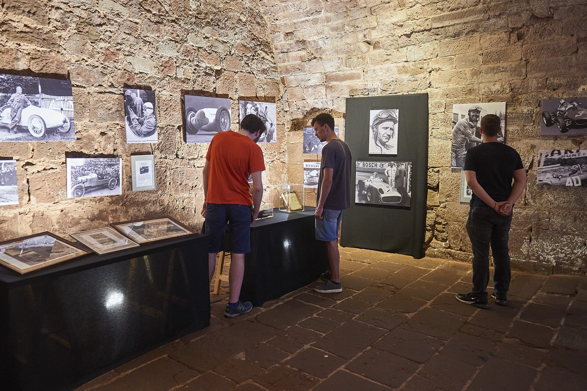 Ebenso werden die Kopfbedeckungen einiger Rennfahrer-Epochen gezeigt. Die Siege, aber auch die Schicksale der Rennauto-Konstrukteure und Rennfahrer werden in der Ausstellung vor Augen geführt. Besonders interessant ist die Darstellung der Kopfbedeckungen – vom mittelalterlichen Wagenbauer bis zur Abbildung eines Rennfahrerhelmes heute sind die Veränderungen und Entwicklungen zu entdecken. Jung und Alt machten sich auf den Weg um in der Ausstellung in Erinnerungen zu schwelgen oder aber in die Entwicklung der der Rad- und Reifenkultur einzutauchen. Einige der ausgestellten Fotos stammen aus dem Nachlass des Fabrikanten Moritz Kleinertz (1904 bis 1973) aus Euskirchen. Er hat einige Momente des Eifelrennens im Jahr 1925 mit seiner Kamera in Nideggen festgehalten. Das Burgenmuseum zeigt seine Eindrücke in der Ausstellung, welche die Atmosphäre von damals detailgetreu wiedergeben.