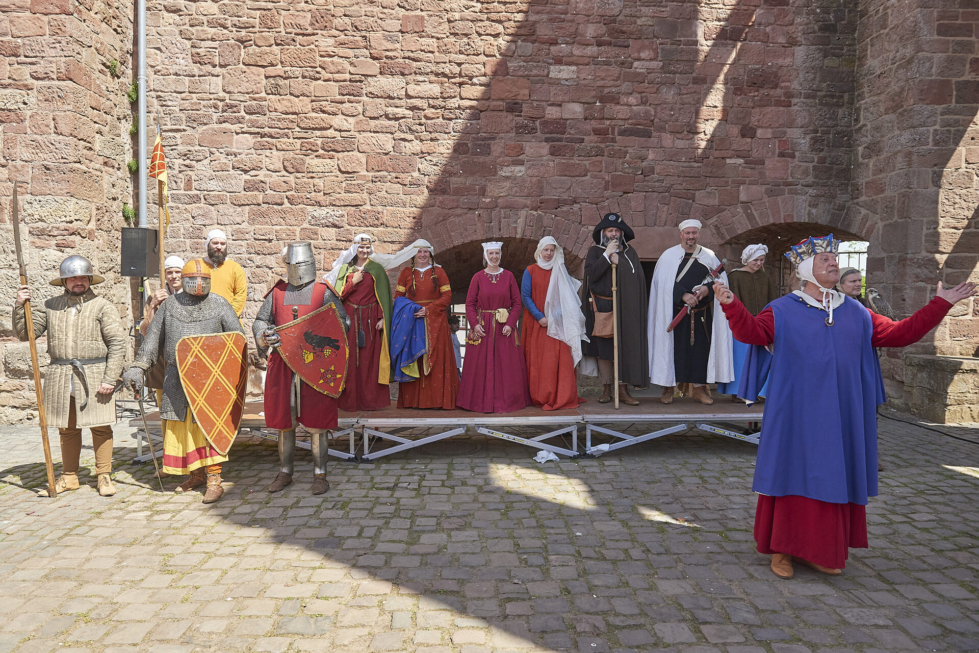 Bei strahlendem Sonnenschein präsentierte der Deutsche Ritterconvent auf dem historischen Palas eine fundiert und kurzweilig moderierte historische Modenschau. Geschäftsführer des Conventes, Gert Klein, erläuterte zahlreichem Publikum die gesellschaftlichen Stände des 12. bis 14. Jahrhunderts. Er selbst war als einer der Ministerialen eines Königs gewandet. Gekonnt wurden die Gewandung und die Verarbeitung der Gürtel, der Handschuhe und die Kopfbedeckungen, wie das Chapel der Damen erläutert. Ein freudiges Raunen ging durch das Publikum, als ein Ritter angefangen von der ritterlichen Unterwäsche bis hin zur vollständigen Rüstung von seinem Knappen angekleidet wurde. „Nun ist er gerüstet“, parierte Gert Klein und verwies auf den bis heute bekannte Satz. Verkörpert wurde ein Ritter aus dem Jahr 1190 – die Zeit in der das erste Gebäude der Burg Nideggen, der Bergfried, Richtfest hatte. Insgesamt besuchten rund 430 Besucher*innen die Aktionen des Burgenmuseums, das sich über so viel Zuspruch und die Möglichkeit das mittelalterliche Leben authentisch vermitteln zu können, sehr freute.