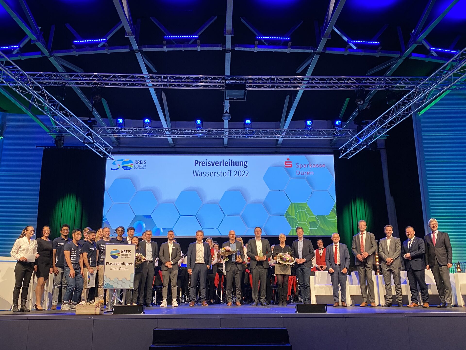 Bei den "Hydrogen Champions", also den Unternehmen, die bereits erfolgreich Wasserstoff-Projekte umsetzen und am Markt etabliert sind, gewann die 2010 in Dresden gegründete Sunfire GmbH. Sie gehört mit rund 400 Mitarbeitern in Deutschland und der Schweiz zu den führenden Unternehmen in der Elektrolyseproduktion. Außerdem ist Sunfire auch in der Herstellung von Synthesegas und E-Fuels mit eigenen Anlagen aktiv. Gründer und Geschäftsführer ist Nils Aldag, der in der Kulturmuschel per Video-Botschaft zugeschaltet war und die Initiative des Kreises Düren mit Landrat Wolfgang Spelthahn an der Spitze lobte. Der Kreis Düren gehe beim Thema Wasserstoff entschlossen voran. Dass es im Kreis Düren eine große Übereinkunft gebe, auf H2 zu setzen, betonte auch Prof. Wolfgang Marquardt (Forschungszentrum Jülich. Es brauche Menschen, „die das anschieben, damit daraus eine Bewegung entsteht“. Die Region stehe in dieser Hinsicht zusammen.