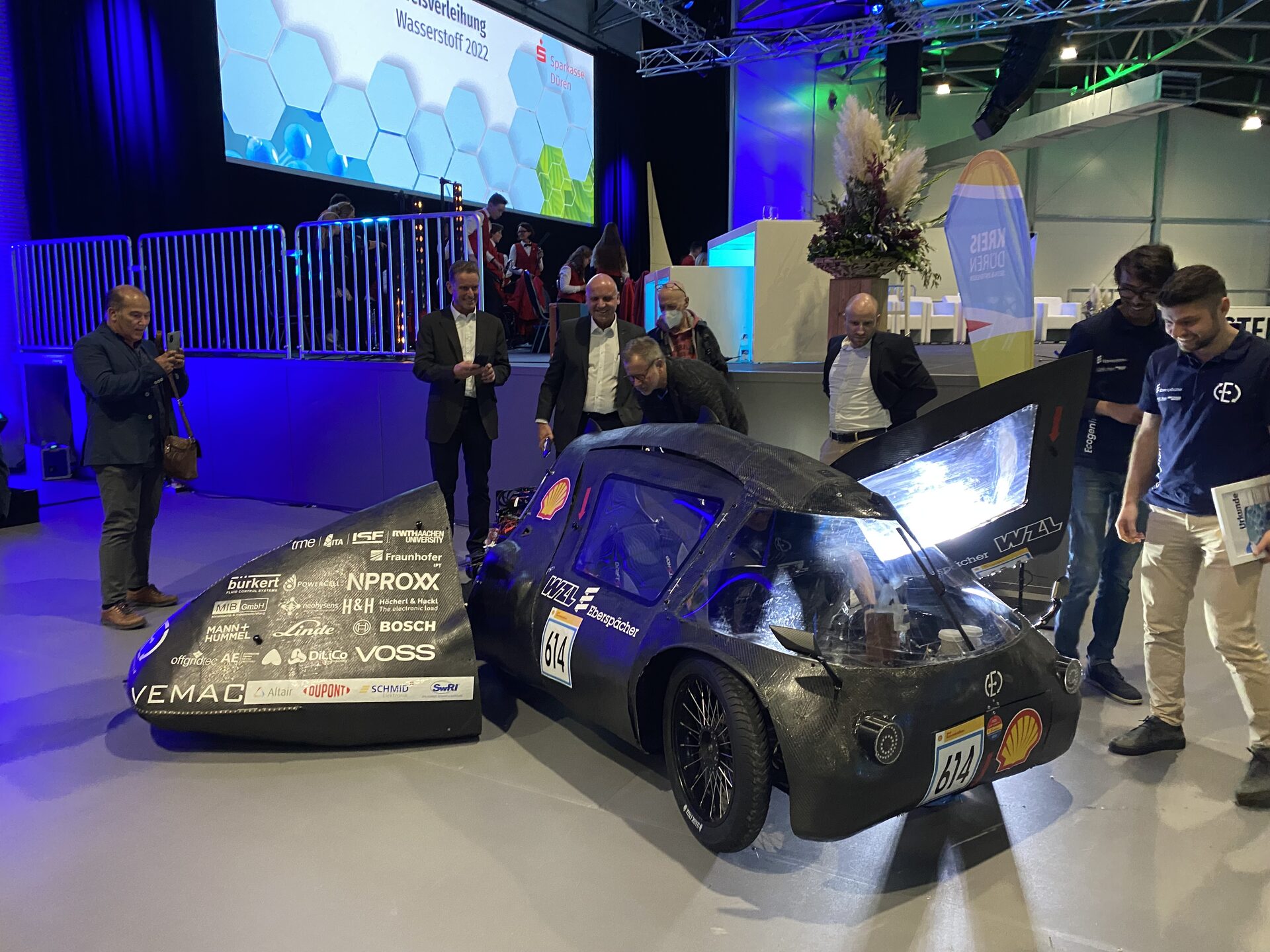 Die Laudatio hielt Dr. Christoph Erdmann, der den Preisträgern bescheinigte, für das Thema Wasserstoff zu brennen und es „erlebbar zu machen“. Weiter betonte er, dass Ecogenium ein Auto an den Start bringen wolle, dass mit so wenig Wasserstoff wie möglich so weit wie möglich kommen wolle.