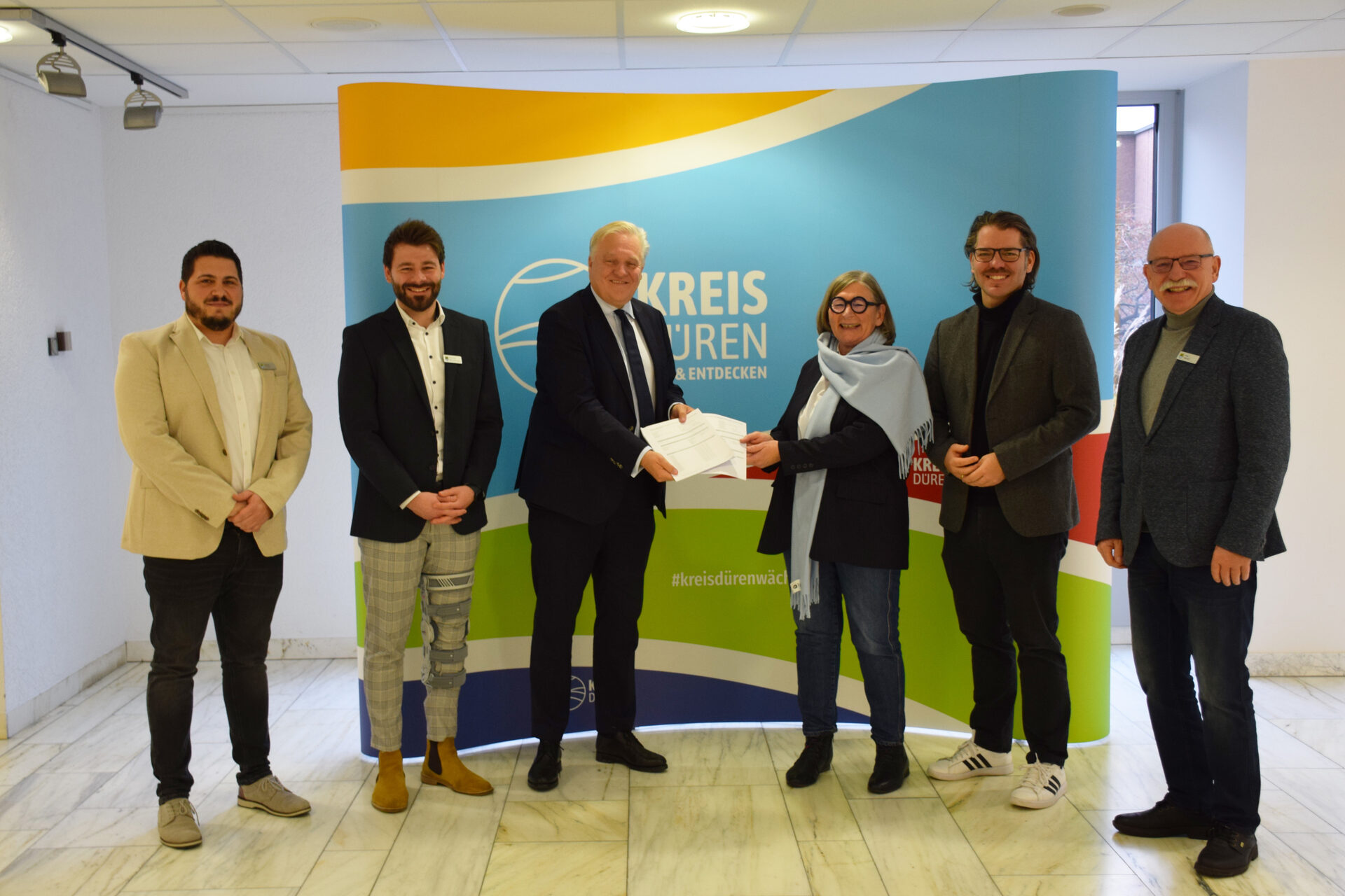 Der Dürener Bauverein investiert in den Wohnungsbau in Düren. Landrat Wolfgang Spelthahn (3.v.l.) überreichte der Vorsitzenden Dagmar Runge (3.v.r.) die Förderzusagen im Beisein von Alexander Corsten und Maximilian Weinberger (Amt für Tiefbauangelegenheiten, Verkehrslenkung und Wohnungsbauförderung) sowie Thomas Hissel und Peter Kaptain (Dürener Bauverein AG/v.l.).