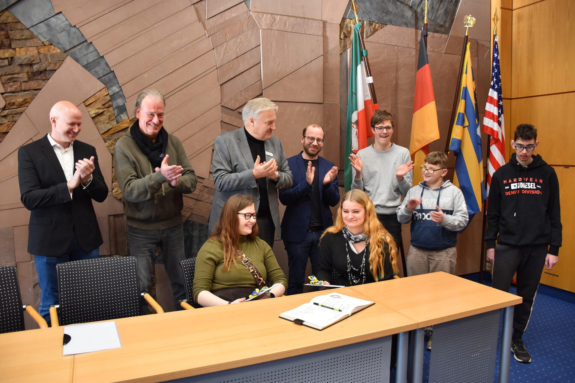 Pia Welsch ist 18 Jahre alt und tritt im Einzel sowie gemischten Doppel im Badminton an. "Der Eintrag in das Goldene Buch ist wirklich etwas ganz Besonderes für mich. Ich freue mich sehr auf Berlin, wir werden unser Bestes geben", erzählt sie mit leuchtenden Augen. Neben ihr sitzt die 16-jährige Kim Heinrichs mit einem freudigen Lächeln im Gesicht. "Das Ganze ist jetzt schon ein so großer Erfolg, mit dem ich niemals gerechnet hätte. Dass wir uns in das Goldene Buch des Kreises Düren eintragen durften, ist toll. So etwas erlebt man nur einmal im Leben."
